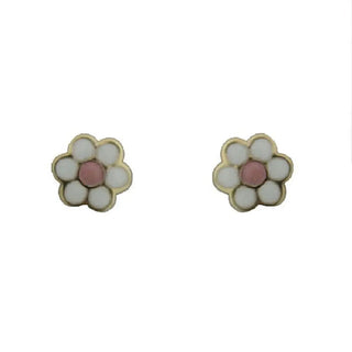 18K Yellow Gold Enamel White and Pink Flower Screwback Earring