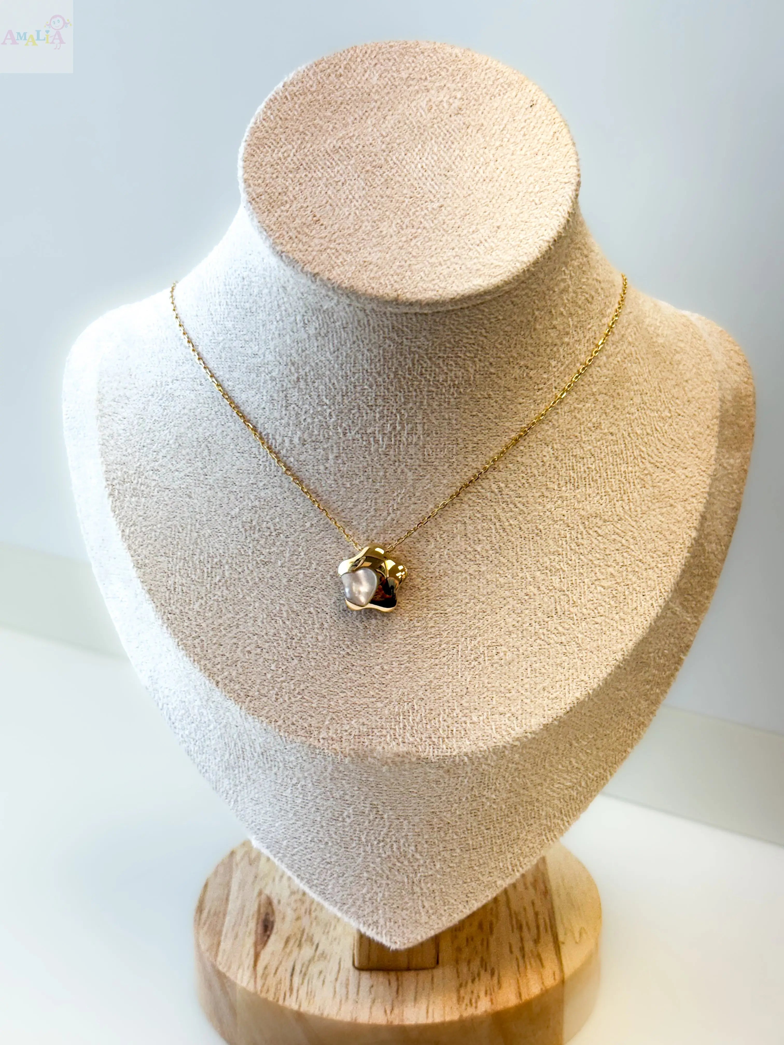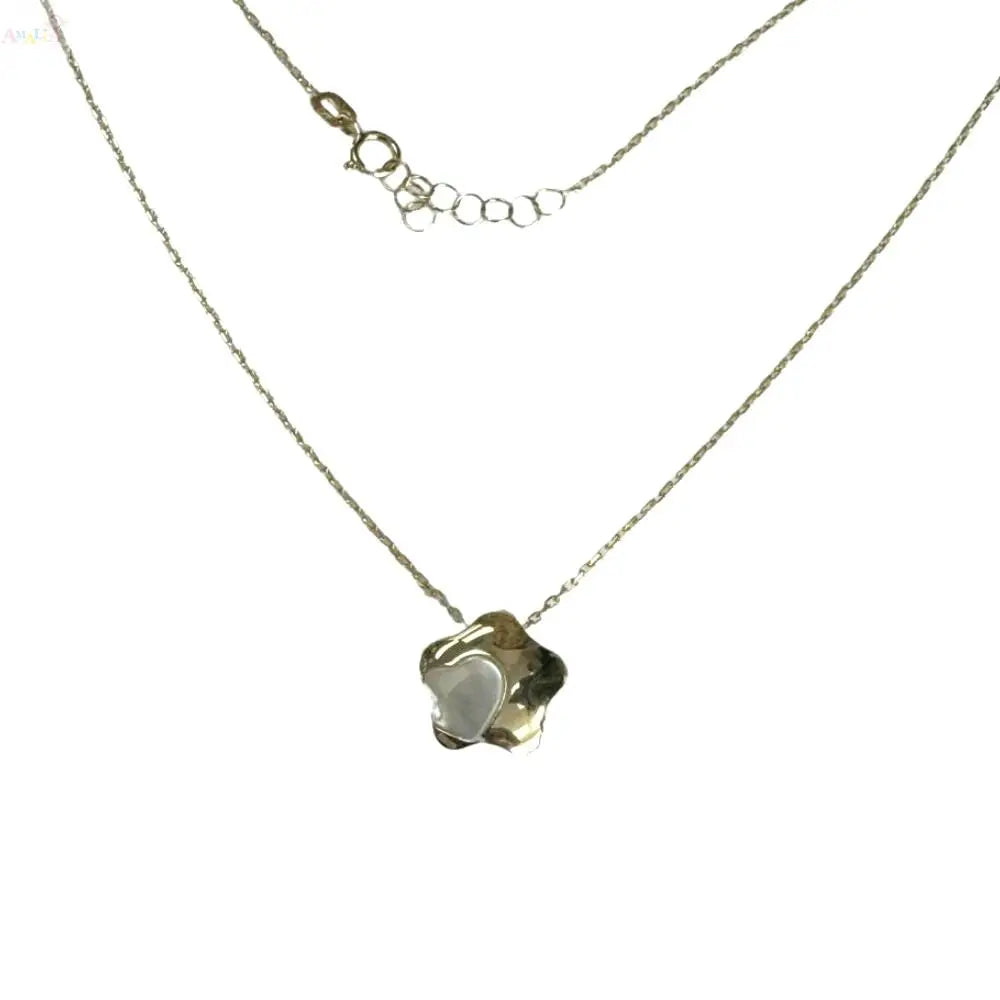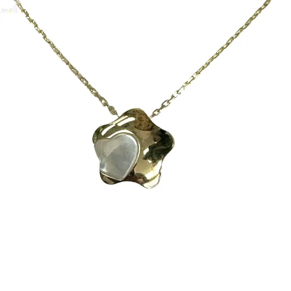 على جانب النجمة، إضافة رقيقة على شكل قلب من عرق اللؤلؤ تضيف عمقًا ومعنى، ترمز إلى الجمال الداخلي والعاطفة الصادقة. يتدلى القلادة بأناقة من سلسلة كابل مقطوعة بالألماس، طولها 16.75 بوصة، مع حلقات إضافية تبدأ من 16 بوصة لضمان ملاءمة مخصصة وقابلة للتعديل.