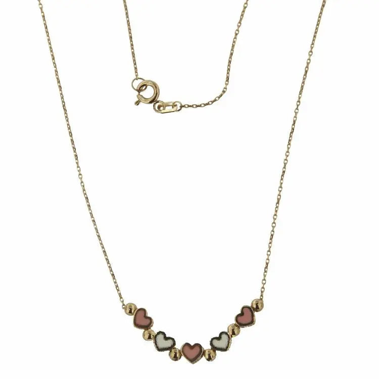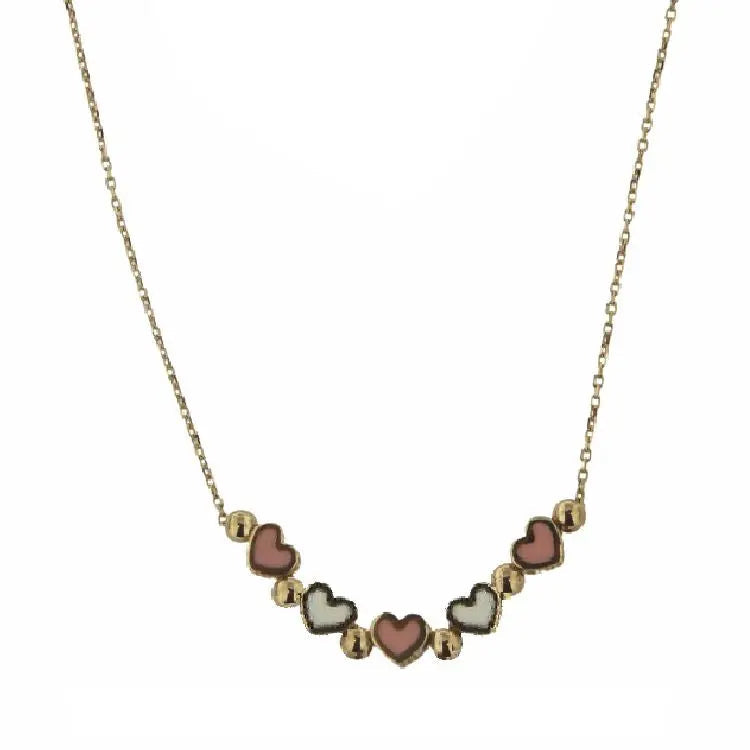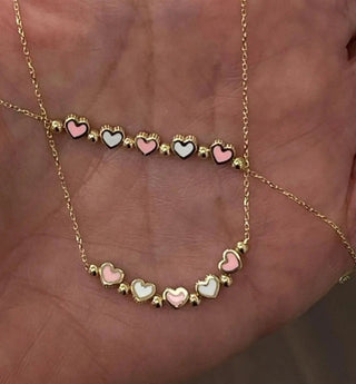 For a coordinated and sophisticated look, pair it with the matching bracelet (SKU FAT2000HB), creating a stunning set that embodies love and elegance. This 18K Yellow Gold Enamel Pink and White Mini Hearts Necklace is more than just an accessory; it's a cherished keepsake that will remind her of your love and thoughtfulness for years to come.