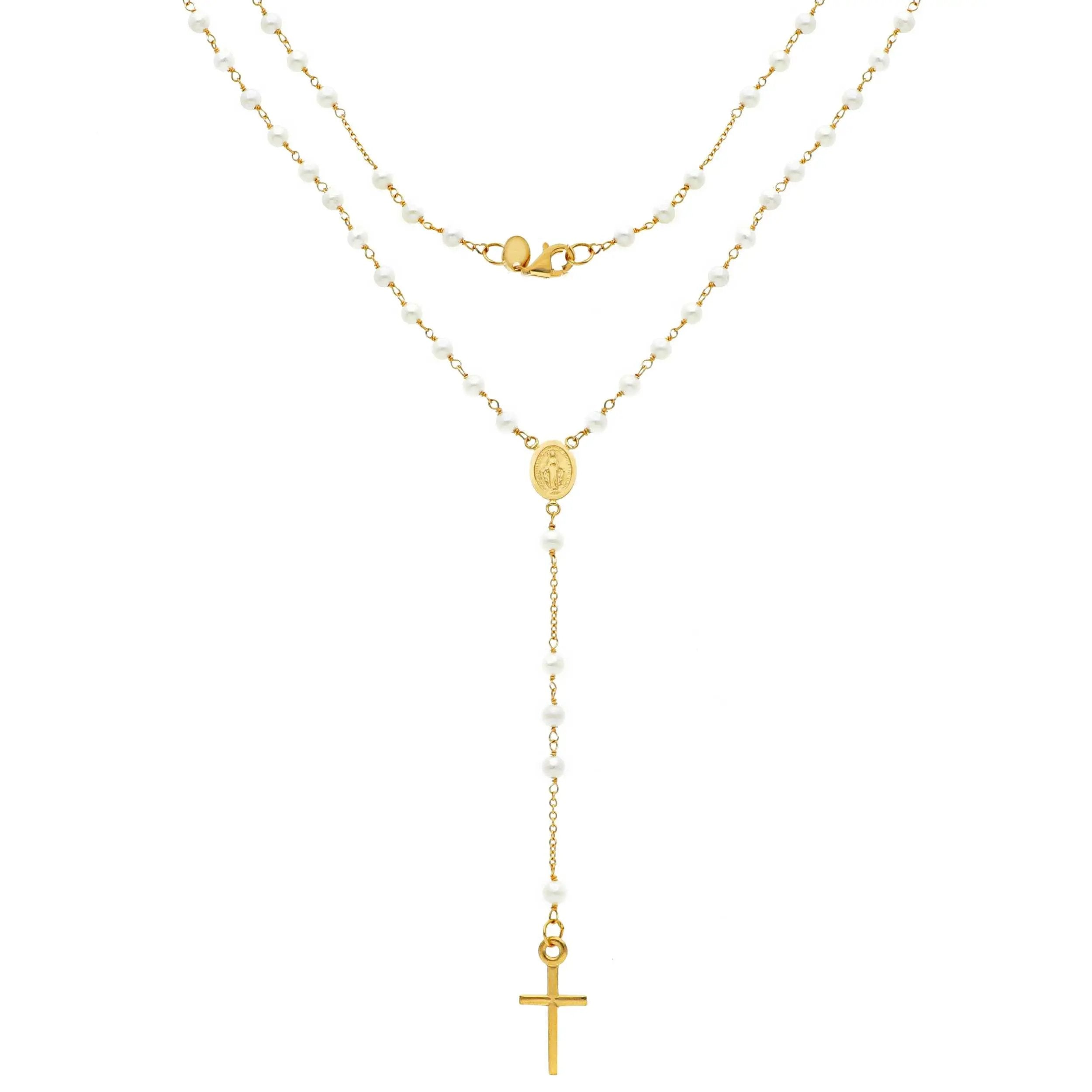Elevate your spiritual journey with our exquisite 18k Solid Yellow Gold 3mm Cultivated Pearls Rosary Necklace. This stunning piece features 59 beads of cultivated pearls, each measuring 3mm, symbolizing purity and grace. The rosary extends 19.50 inches from the medal upward, designed for ease and elegance with a convenient lobster clasp closure positioned on the top right side of the chain.