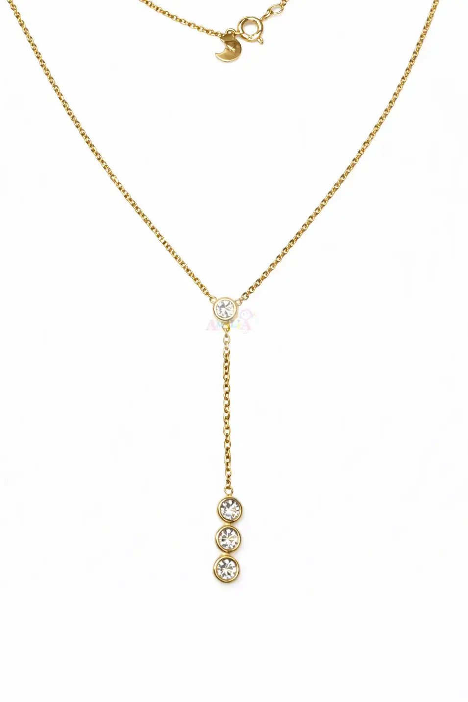 The necklace measures 16 inches in length, with a 1.5 inch (38 mm) drop from the center bezel zirconia, including the three lower stones. The 0.6 mm diamond cut cable chain adds subtle shimmer, while a secure spring ring clasp ensures comfortable daily wear.