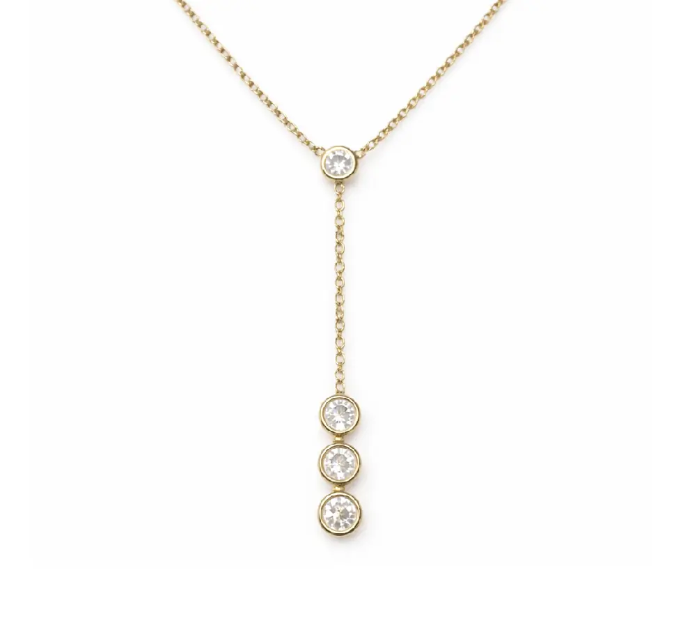 Elevate your jewelry collection with this 18K Solid Yellow Gold Four Zirconia Drop Y Necklace, designed for timeless elegance and everyday brilliance. Crafted in hypoallergenic solid 18K yellow gold, this delicate piece features a sparkling center bezel-set zirconia measuring 0.14 inches (3.5 mm). From that center stone hangs a fine diamond cut cable chain, creating a graceful Y silhouette finished with three additional bezel-set zirconia stones at the bottom, each also 0.14 inches (3.5 mm) in diameter.