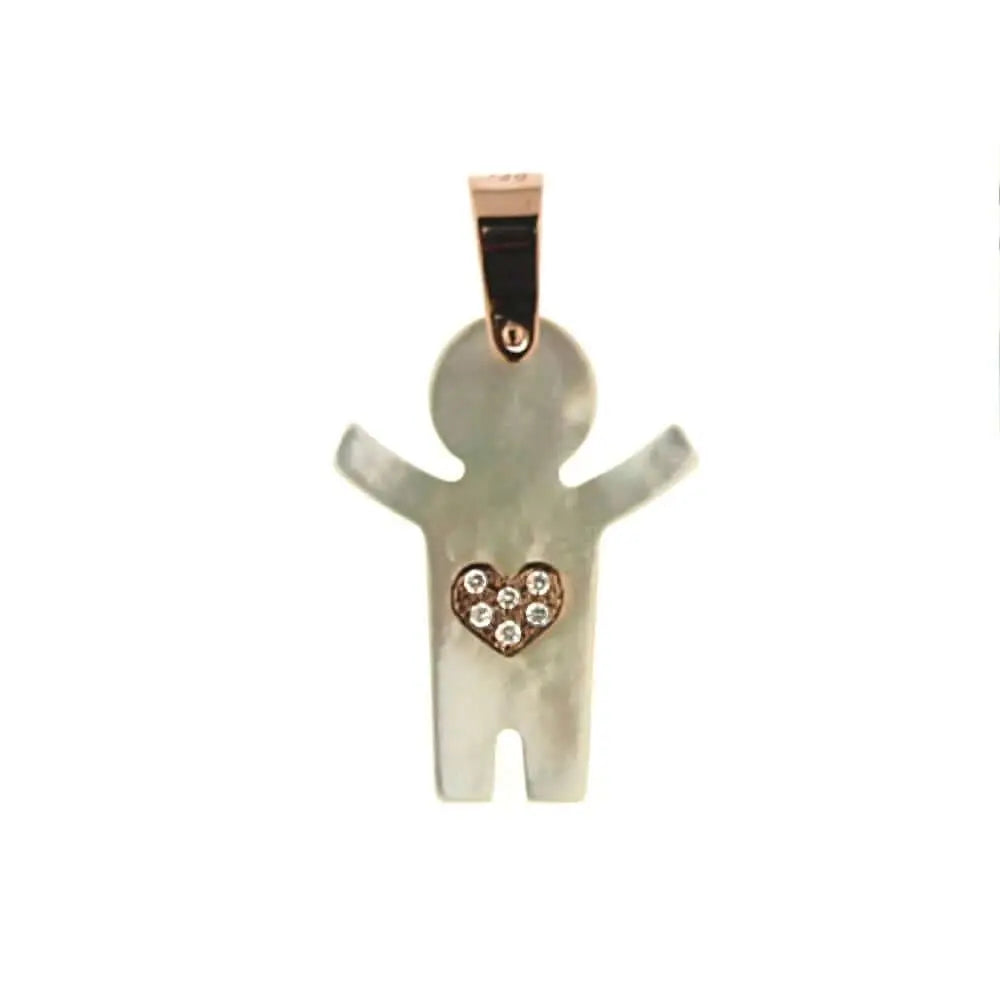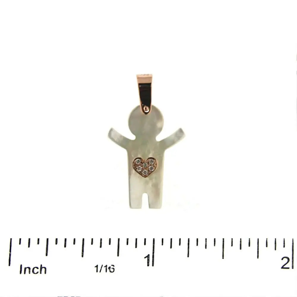 The pendant boasts a unique design with white mother of pearl expertly cut into the shape of a boy. At the center, a sparkling diamond heart adds a touch of elegance and love, symbolizing the deep bond between a mother and her child. The gold bail completes the design, allowing for easy attachment to any chain.