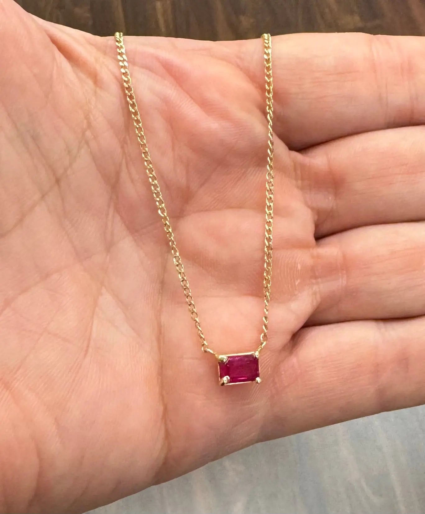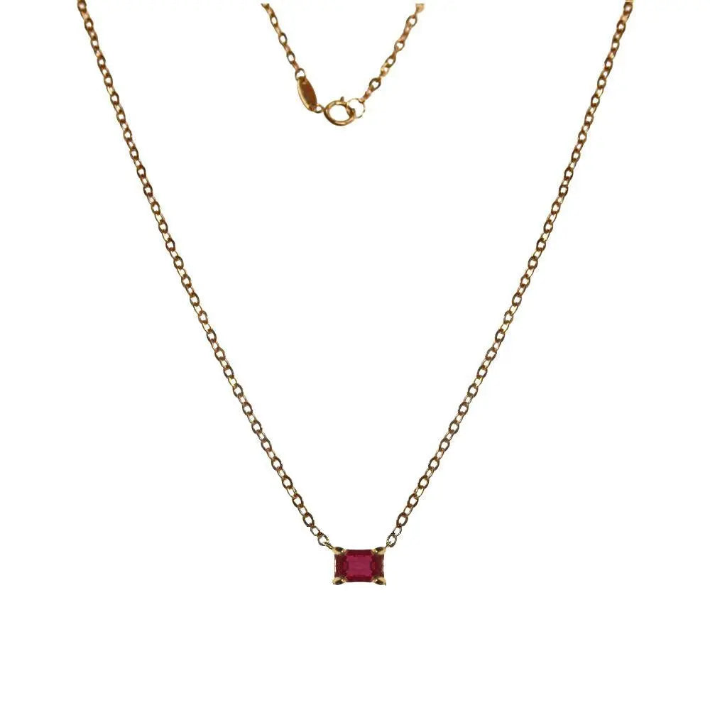 Discover the allure of the 18K Solid Yellow Gold Solitaire Ruby Curb Chain Necklace, a luxurious piece designed to captivate. Made with hypoallergenic 18K solid yellow gold in the USA, this necklace features a stunning AAA quality ruby, meticulously cut into a 7x5mm rectangle with a 1.2 ct weight, set horizontally at the center of a curb chain. The chain, crafted in 18K yellow gold, measures 16 inches with an additional ring at 14 inches, offering versatile wear for both women and teenagers.