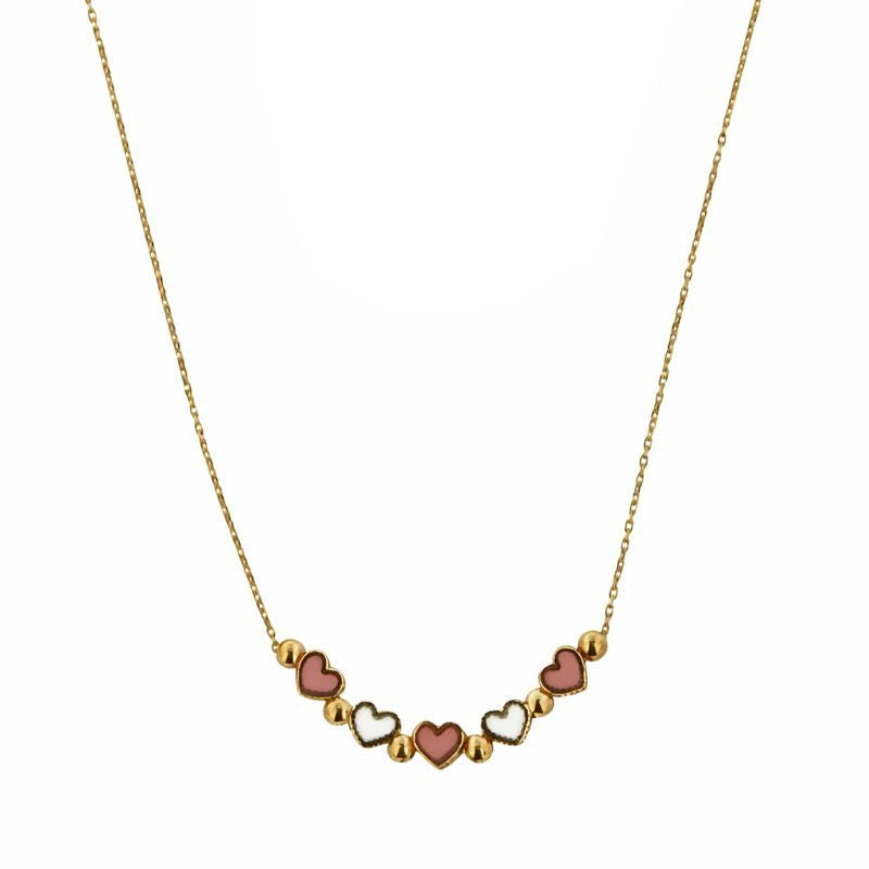 For a coordinated and sophisticated look, pair it with the matching bracelet (SKU FAT2000HB), creating a stunning set that embodies love and elegance. This 18K Yellow Gold Enamel Pink and White Mini Hearts Necklace is more than just an accessory; it's a cherished keepsake that will remind her of your love and thoughtfulness for years to come.