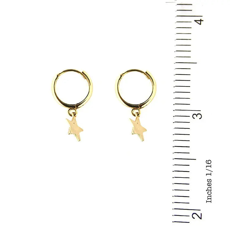 18K Solid Yellow Gold Polished Dangle Star Hinge Hoop Huggie Earrings. These stunning earrings feature a huggie diameter of 0.41 inch (10.5mm) and a charming star size of 0.25 inch (6.4mm), making them the ideal accessory for ages 3 to 14 years old.
