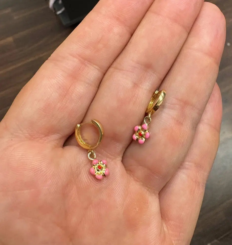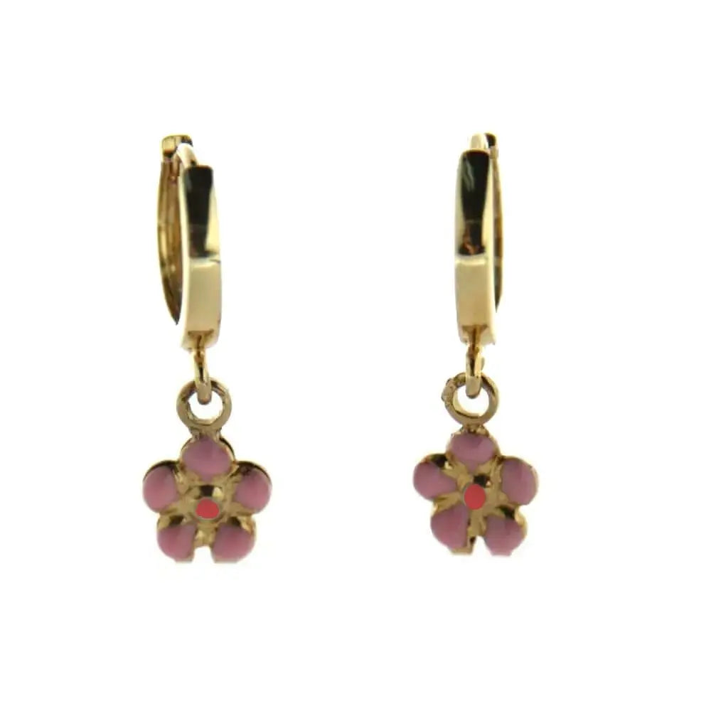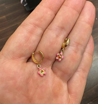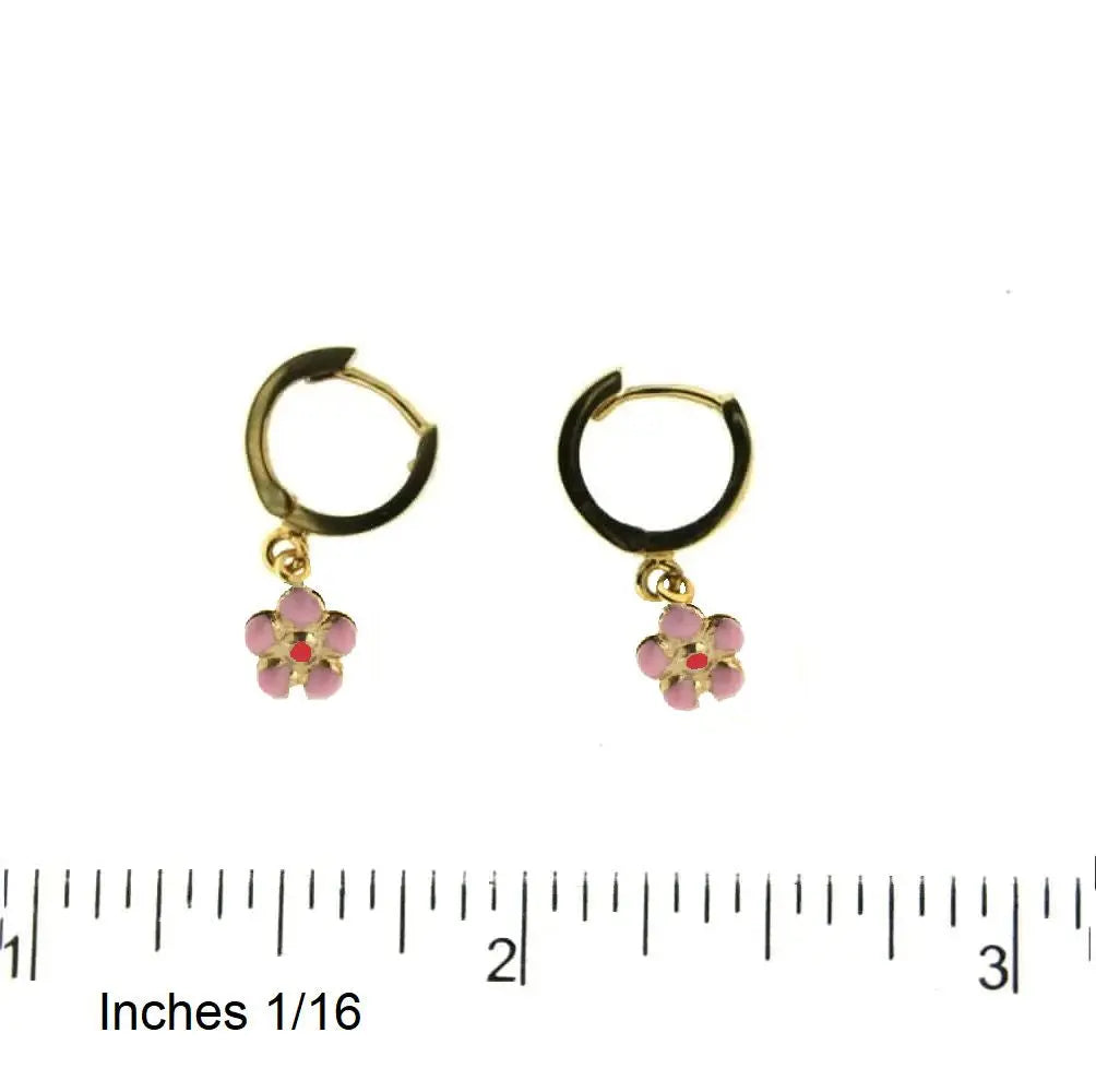 Introduce a touch of whimsy to your little girl's wardrobe with our 18K Gold Pink and Red Flower Hinge Hoop Huggie Earrings, featuring a delightful pink enamel flower with a vibrant red center. These earrings are perfectly sized with a flower diameter of 0.20 inches, huggies measuring 0.39 inches, and a total length of 0.79 inches, making them ideal for girls aged 3 to 8 years.