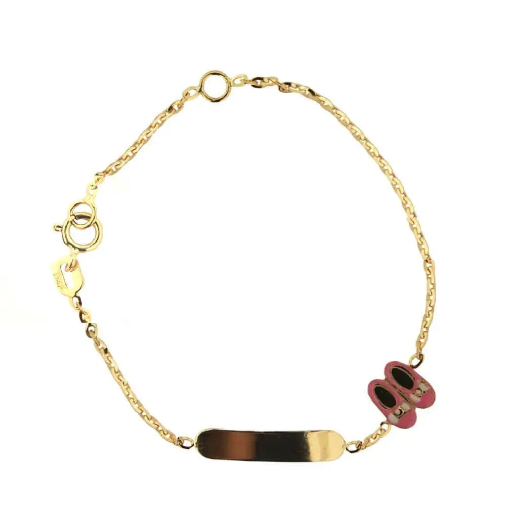 Delight your little one with the enchanting 18K Yellow Gold Pink Enamel Ballet Slippers ID Bracelet from Amalia Jewelry. Designed for girls ages 1 to 5, this elegant piece features a 5.5-inch length with an additional ring at 4.8 inches, ensuring a secure and adjustable fit. The bracelet is crafted in Italy from hypoallergenic 18K solid yellow gold, combining timeless quality with delicate design.