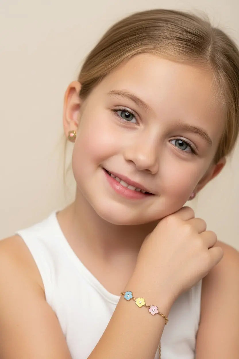 Surprise your little girl with a vibrant and joyful accessory—our 18K Yellow Gold Multi Color Enamel Center Flowers Bracelet, the perfect gift for any special occasion. This enchanting piece features three delicate enamel flowers: one in pink, one in blue, and one in sunny yellow with a white center—adding a cheerful burst of color to her jewelry collection.