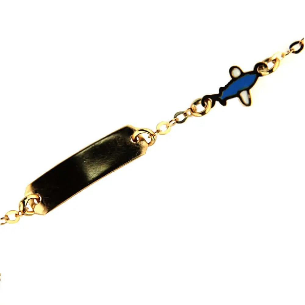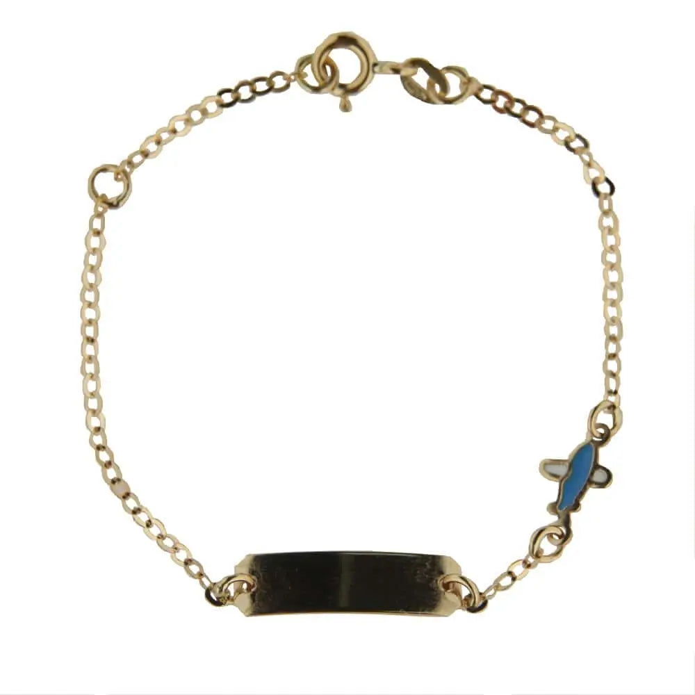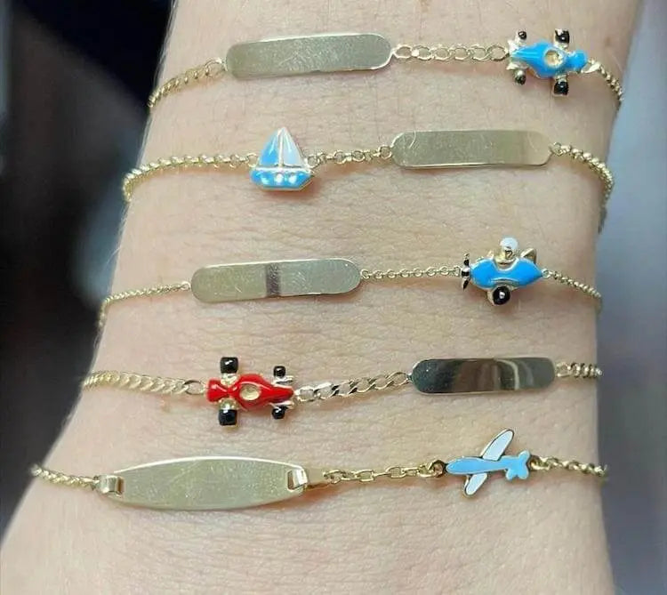 18K Solid Yellow Gold Blue and White Enamel Airplane ID Bracelet, perfect for boys. This bracelet measures 5.25 inches with an extra ring at 4.75 inches, designed to grow with your child. The beautiful blue and white enamel airplane design adds a touch of excitement to this elegant piece. Our 18K Solid Yellow Gold Blue Enamel Airplane ID Bracelet comes in a beautifully packaged Amalia blue gift box, and there is an option to personalize it with a name engraving for an extra fee.