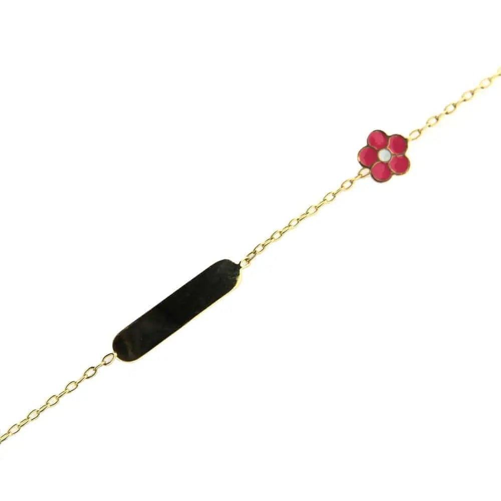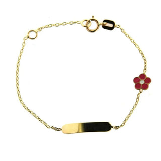 Bring a touch of spring to your little one's wrist with this gorgeous 18K Solid Yellow Gold Enamel Pink Flower ID Bracelet. Measuring 5.5 inches with an extra ring at 5 inches, this bracelet is designed for ages 0 to 5 years old. The stunning enamel pink flower adds a pop of color and beauty, making it a standout piece. The option to have it engraved for a fee adds a personal touch, making it a one-of-a-kind gift. Made from 18K hypoallergenic gold, this bracelet is gentle on delicate skin. The bracelet comes with an Amalia Gift Box and Bag, making it a perfect present for any special occasion.