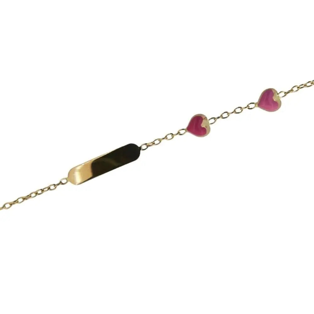 Treat your loved one to a timeless piece of jewelry they will cherish for years to come. This 18K Solid Yellow Gold Pink and Fuchsia Enamel Hearts ID Bracelet is not just a gift, but a lasting symbol of affection and childhood joy.