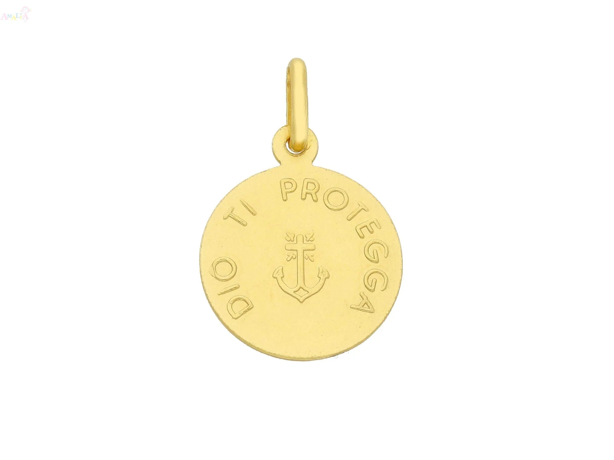 On the reverse side, the medal displays the phrase “DIO TI PROTEGGA” (Italian for “God Protect You”) in high relief, along with a raised cross and anchor—a timeless symbol of protection, faith, and spiritual grounding.