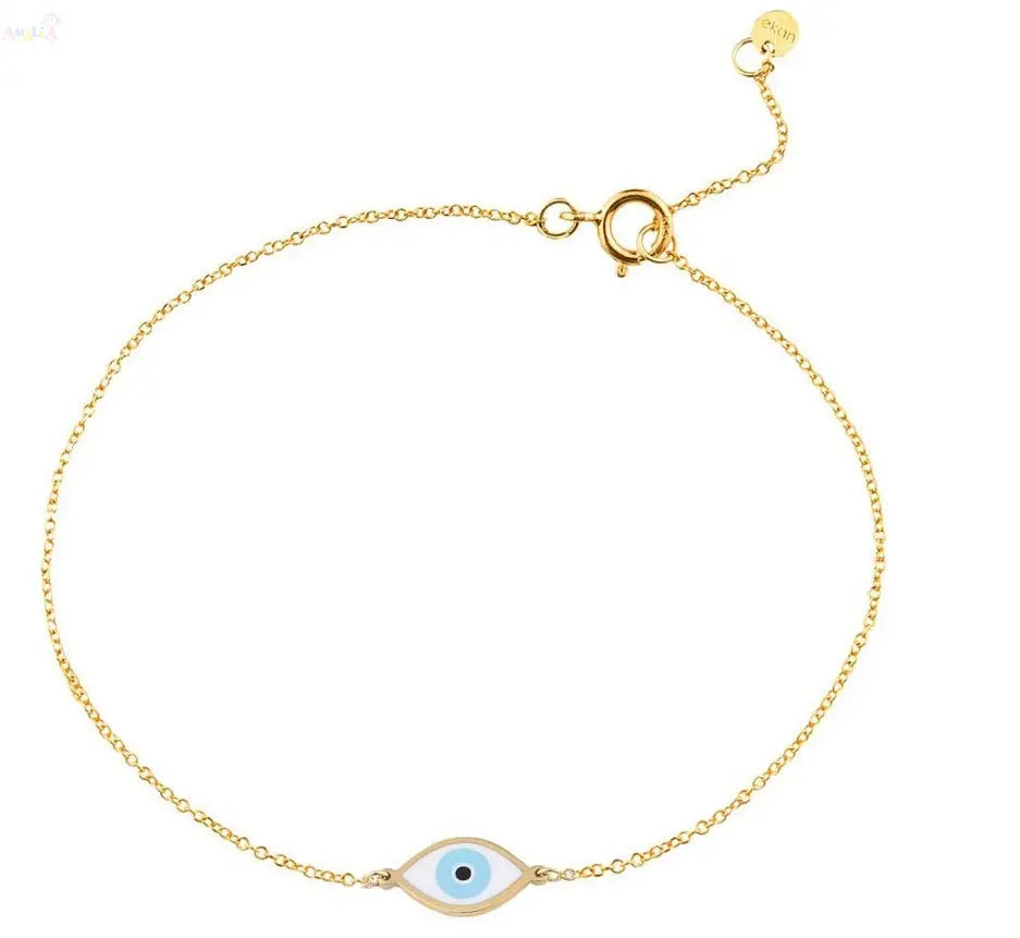This stunning 18K Solid Yellow Gold White Ceramic Evil Eye Bracelet blends timeless elegance with symbolic meaning. Expertly crafted in Greece, it features a smooth white, light blue, and black oval ceramic evil eye—a classic Mediterranean charm believed to ward off negative energy and bring protection, luck, and balance. The pure 18K hypoallergenic gold is lead- and nickel-free, making it perfect for sensitive skin and daily wear.