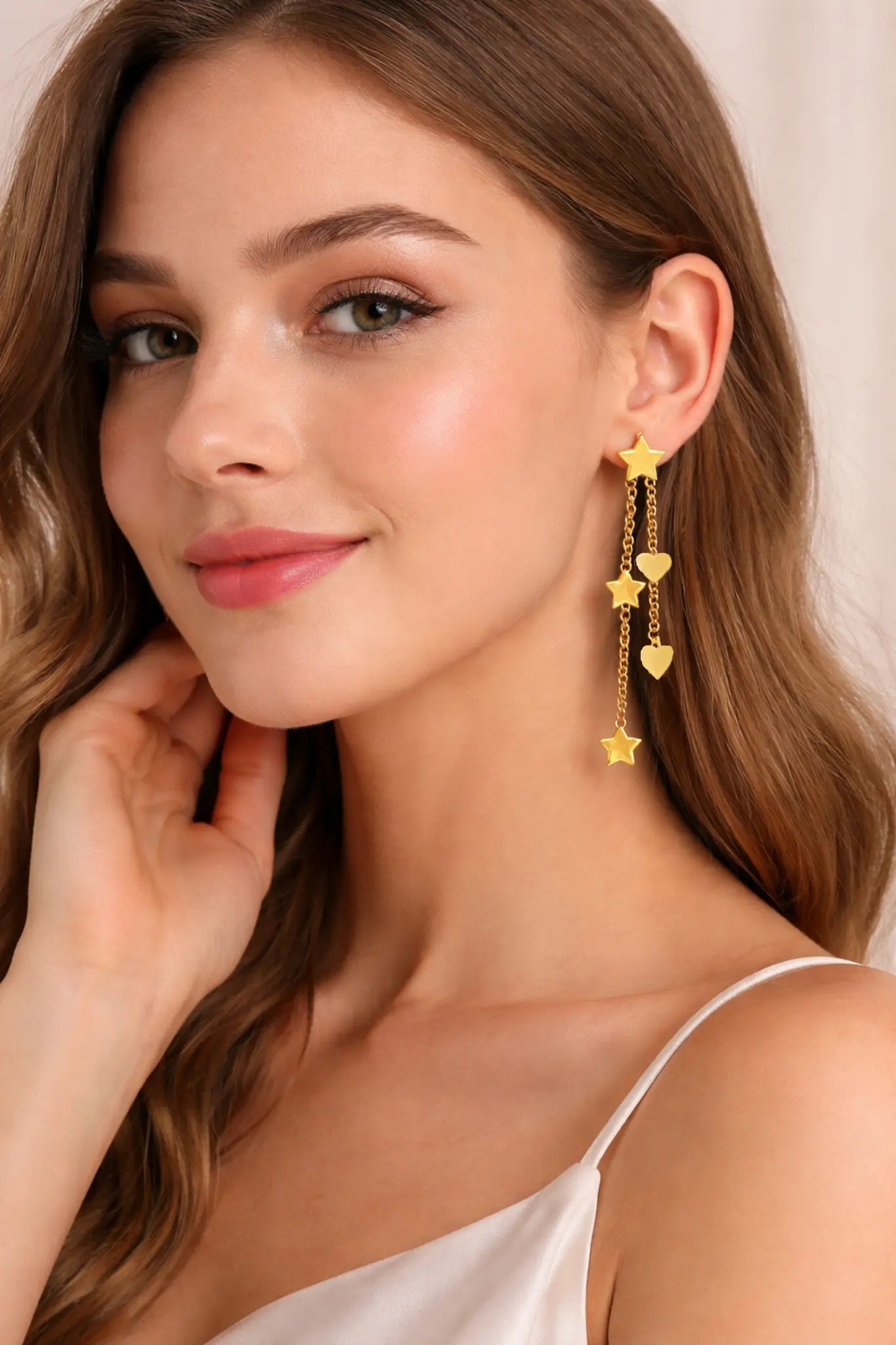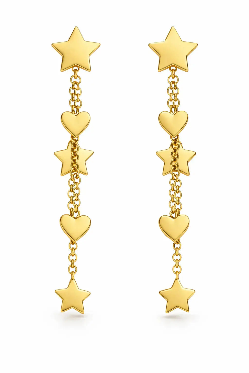 Shine Bright with Stars and Hearts Elegance: 18K Solid Yellow Gold Stars and Hearts Dangle Long Earrings