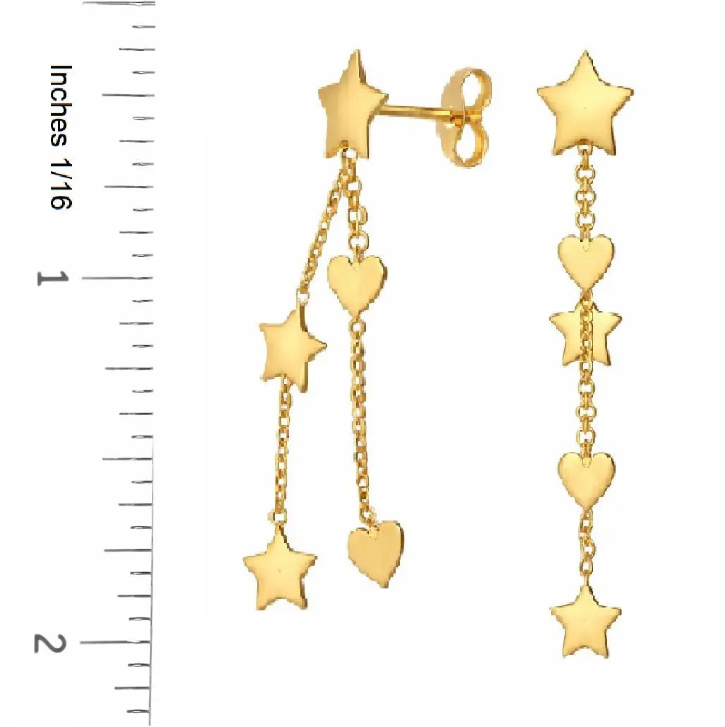 18K Solid Yellow Gold Stars and Hearts Dangle Long Earrings