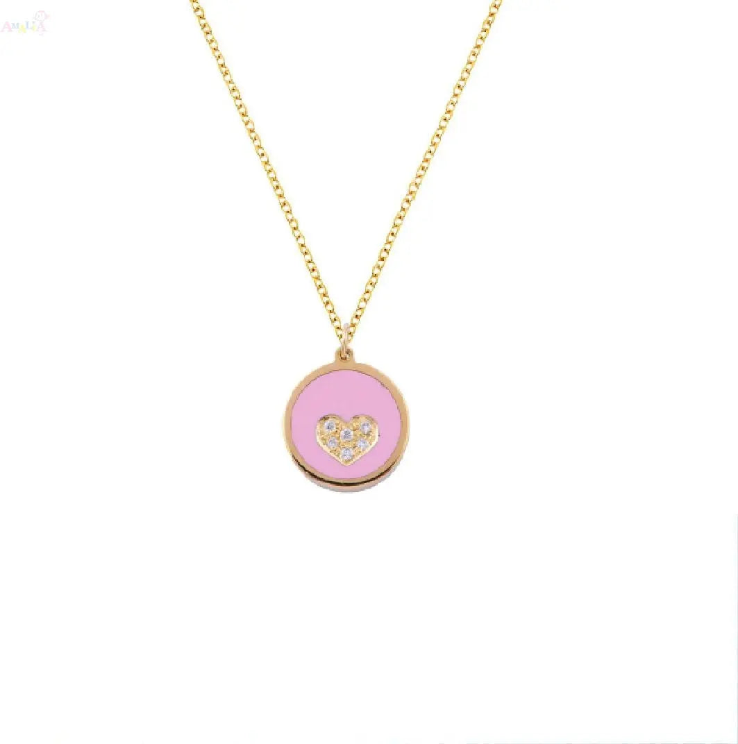 Delicate and modern, our 18K Sold Yellow Gold Pink Ceramic and Diamond Hear Circle Pendant is a refined expression of love and elegance. With a diameter of 0.37 inches (9.4 mm), this minimalist piece features a soft pink ceramic circle set in hypoallergenic 18K solid yellow gold, accented by a small heart inset with 0.024 total carat weight of natural diamonds.