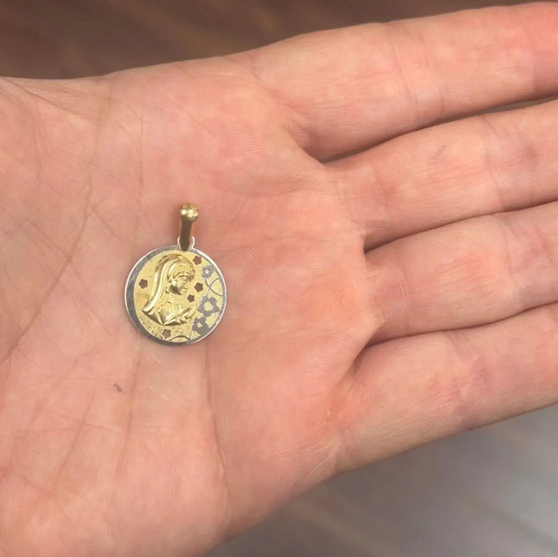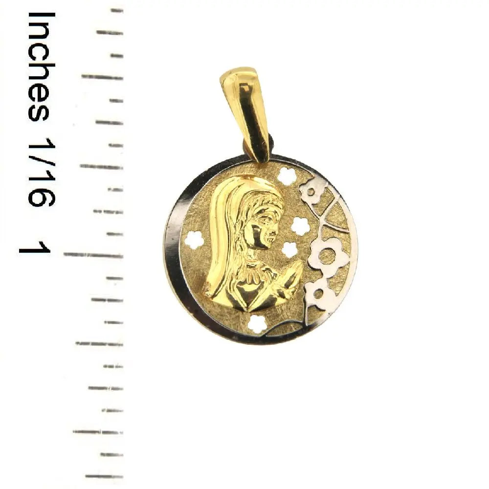 Discover the perfect religious gift for young girls with our 18k Solid Two Tone Gold Praying Girl Medal Pendant, a symbol of faith and innocence. Adorned with open yellow gold flowers and delicate white gold accents, this exquisite medal captures the purity of a young girl's prayers. Measuring 0.68 inches (17mm) in diameter, it boasts a stunning satin and polished finish, exuding timeless elegance. Crafted from hypoallergenic gold, this pendant is gentle on sensitive skin, making it ideal for girls aged 8 and up.