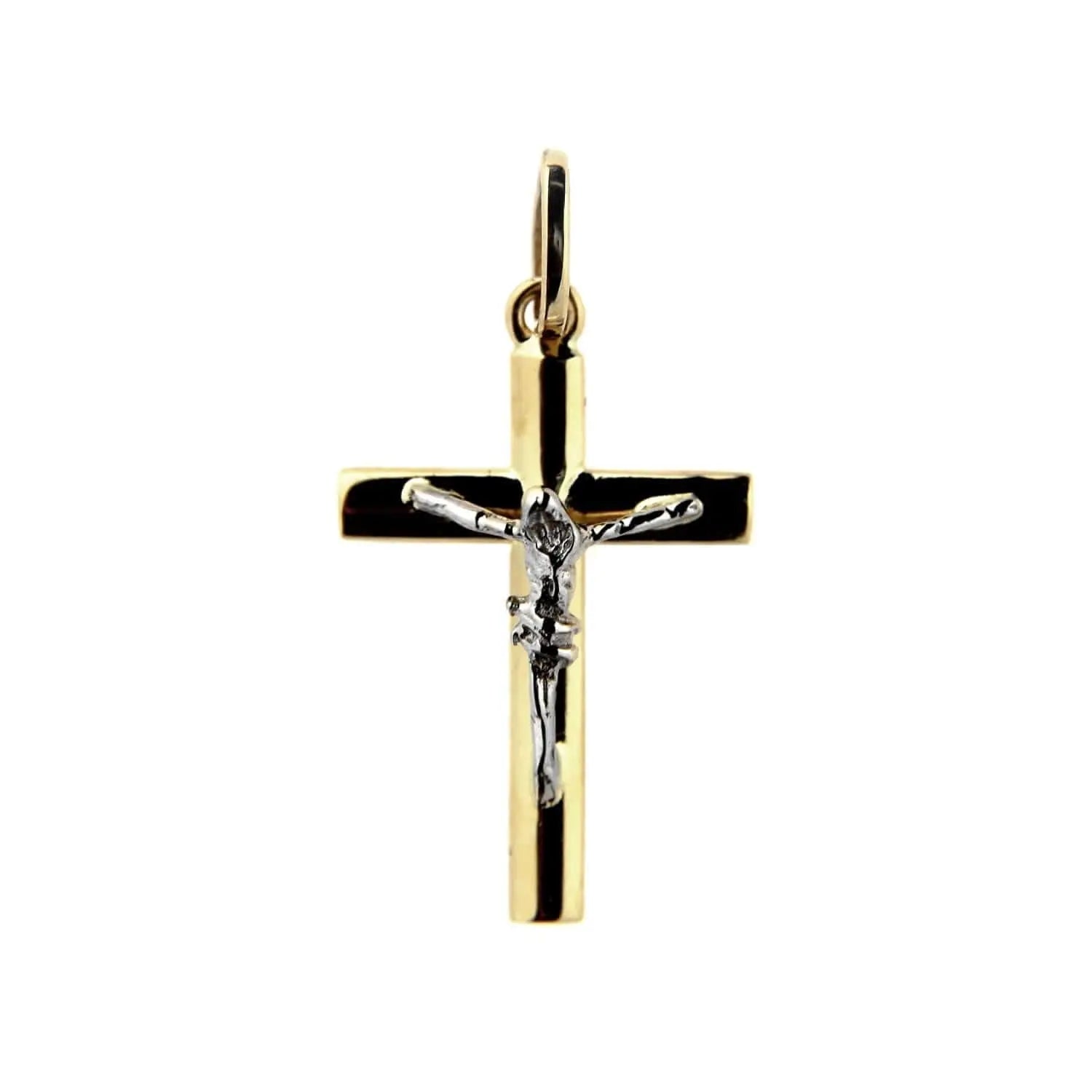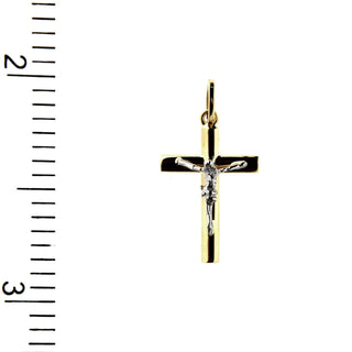 Celebrate your faith with the beautifully crafted 18K Two Tone Small Crucifix Pendant, a meaningful symbol of devotion and sacrifice. This pendant features dimensions of 0.82 inches (21mm) by 0.44 inches (11mm) and showcases a stunning design with a yellow gold oval hollow tube and a figure of Christ in contrasting white gold.