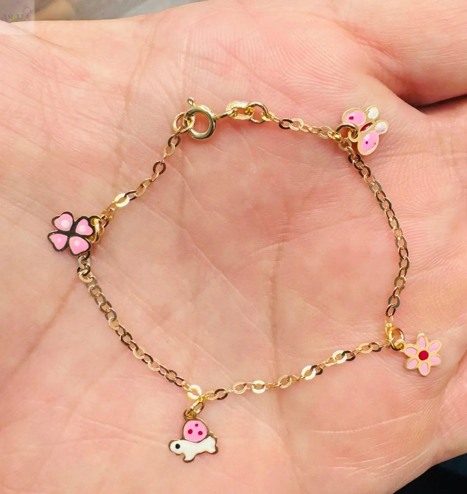 Elevate her style with our enchanting 18K Yellow Gold Dangle Butterfly Flowers and Turtle Bracelet, a joyful blend of charm and elegance. Expertly crafted in Italy from hypoallergenic 18K solid yellow gold, this bracelet is lead and nickel free, ensuring safety and comfort for delicate skin. Its playful design showcases dangling pink enamel charms — a butterfly, a flower, a turtle, and a clover — each symbolizing beauty, luck, and happiness. The vivid pink details add a touch of whimsy while complementing the radiant yellow gold, creating a bracelet that is both youthful and timeless. Measuring 6 inches, it is the perfect size for girls ages 7 and up, offering a comfortable fit as she grows. This delightful piece is ideal for everyday wear or special occasions, adding sparkle and personality to any outfit. Presented in the signature Amalia pink gift box and bag, it comes ready for gifting, making it a memorable present for birthdays, holidays, or simply to show love.