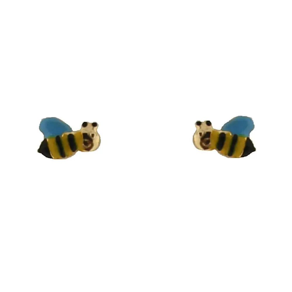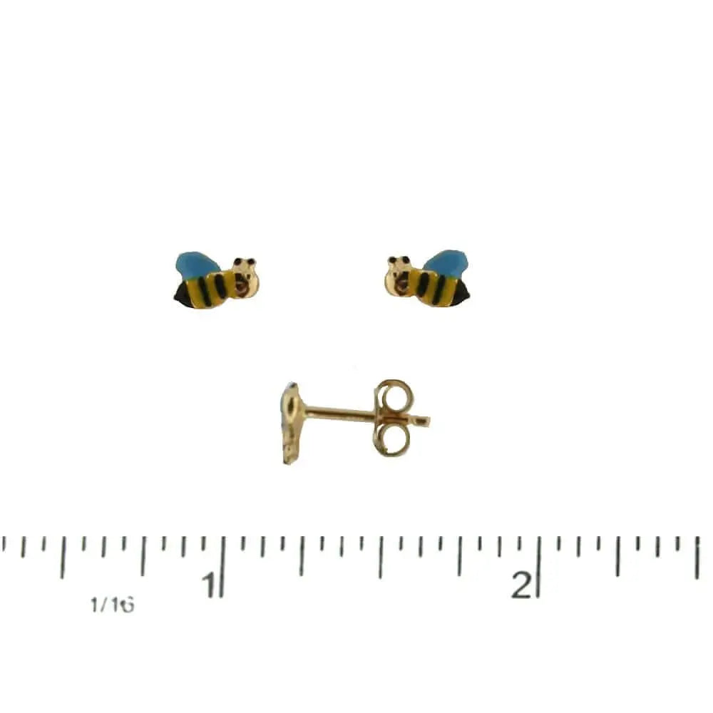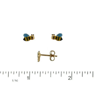 18K Yellow Gold Enamel Yellow Blue and Black Bumble Bee Post Earrings 0.28 inch