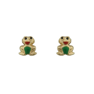 18K Solid Yellow Gold Green Enamel Frog Screwback Earrings