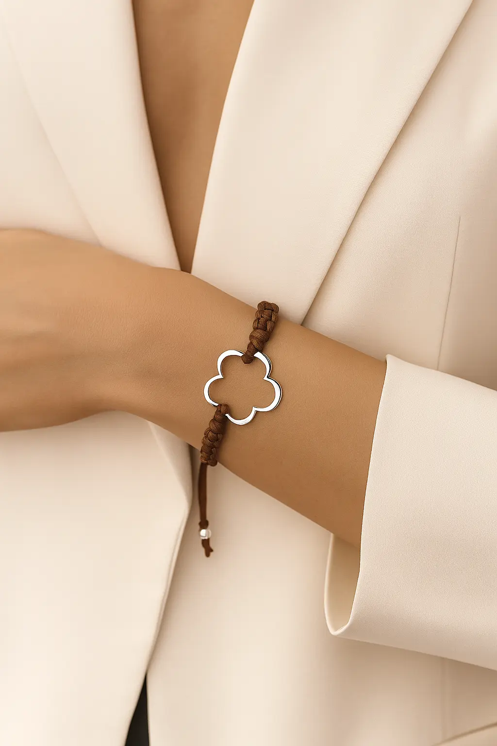 Dieses Armband ist von Größe 6 bis 8 Zoll verstellbar und sorgt so für einen bequemen Sitz bei verschiedenen Handgelenkgrößen. Das herausragende Merkmal ist das große offene Blumenmittelstück aus Sterlingsilber, das 1,00 x 1,14 Zoll misst. In Kombination mit einem robusten braunen Band entsteht ein stilvolles und zugleich vielseitiges Stück, das sowohl zu legeren als auch zu formellen Looks passt.