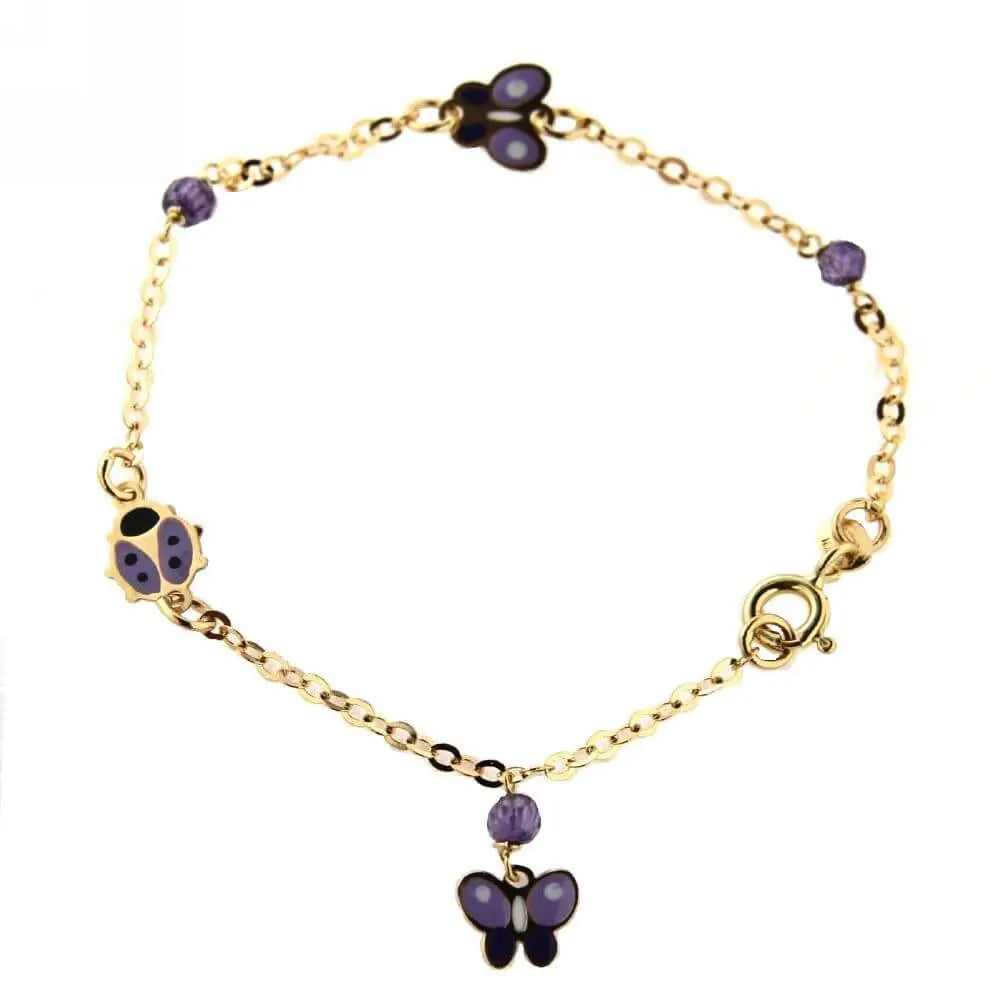 Añade un toque de magia y belleza al armario de tu niña con esta pulsera de mariposa y mariquita esmaltada en lila de oro amarillo de 18K. Con una longitud de 5.25 pulgadas, esta pulsera es perfecta para edades de 3 a 7 años. El encantador diseño de mariposa y mariquita esmaltada en lila brilla con la adición de piedras moradas, convirtiéndola en un accesorio verdaderamente único. La pulsera también cuenta con un colgante de mariposa, que añade un toque extra de encanto. Fabricada con oro amarillo hipoalergénico de 18K, esta pulsera es suave con la piel delicada y ofrece un ajuste cómodo. Presenta esta hermosa pieza en la caja y bolsa de regalo Amalia incluidas, lo que la convierte en un regalo ideal para una ocasión especial.