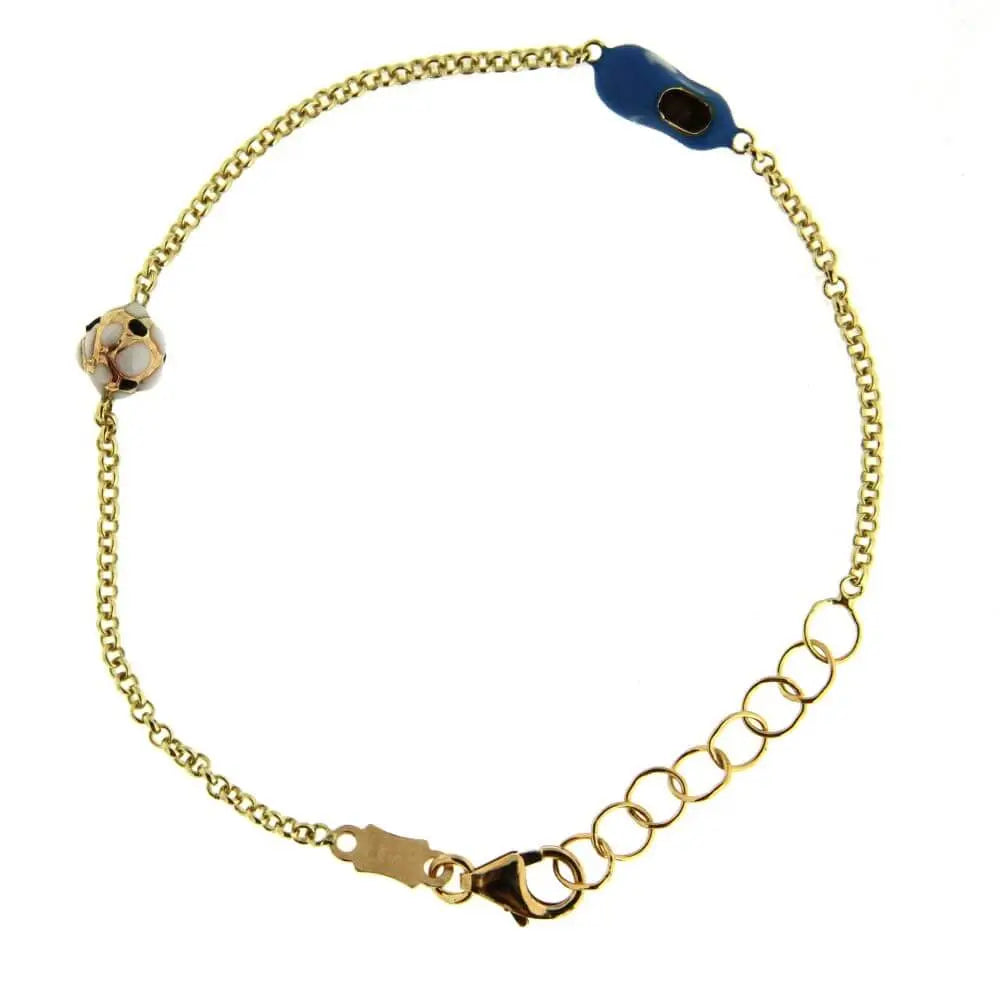 Sumérgete en la pasión por el juego con nuestra encantadora pulsera de balón y zapato de fútbol esmaltada en oro amarillo de 18K. Fabricada en Italia, captura la esencia del fútbol con un detalle meticuloso. Mide 5.6 pulgadas, con anillos ajustables que comienzan en 4.8 pulgadas, asegurando un ajuste perfecto para tu joven atleta. Elaborada con oro hipoalergénico de 18K y esmalte libre de plomo, garantiza tanto seguridad como durabilidad. Cada pulsera viene acompañada de una elegante bolsa y caja de regalo, siendo una elección ideal para cualquier entusiasta del fútbol. Deja que tu hijo muestre su amor por el deporte con estilo y sofisticación.