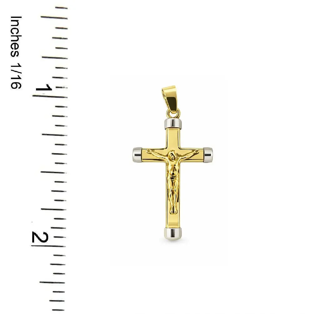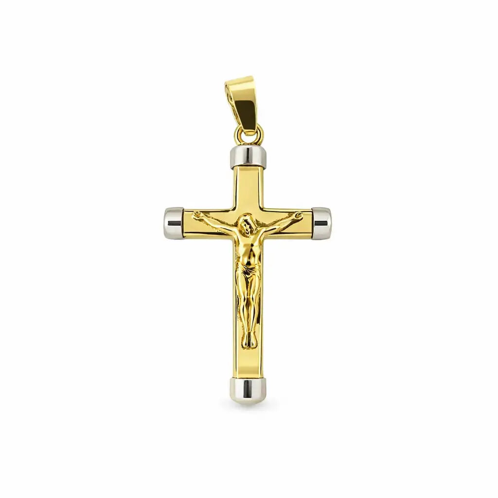 Regala un símbolo de fe y elegancia con nuestro colgante pequeño de crucifijo pulido en oro macizo de dos tonos 18K. Esta pieza exquisita mide 1.09 x 0.52 pulgadas, incluyendo el asa, y presenta un impresionante diseño bicolor con extremos en oro blanco. Su crucifijo moderno y elegante es una expresión ideal de compromiso espiritual, convirtiéndolo en un regalo significativo para bautizos, confirmaciones o como un recuerdo preciado.