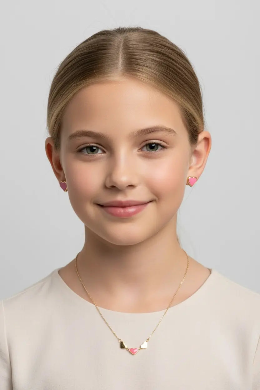Disfruta del encanto cautivador de nuestro collar de corazones esmaltados en oro amarillo macizo de 18 quilates en 3 colores: corazones rojos, rosas o turquesas. Este exquisito collar presenta tres corazones bellamente elaborados, con el corazón central adornado con el esmalte vibrante en rojo, rosa suave o turquesa cautivador, según tu elección. Cada corazón irradia encanto y elegancia, añadiendo un toque de distinción a cualquier conjunto.
