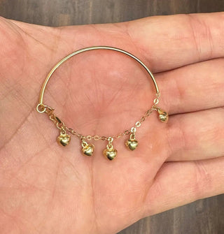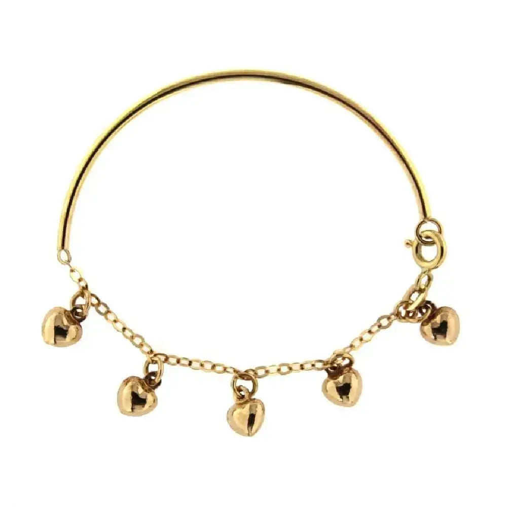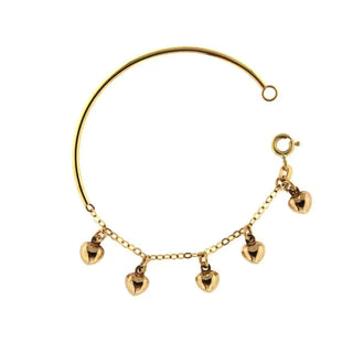 Cinco adorables dijes de corazón abultado cuelgan delicadamente de la cadena, aportando un toque juguetón pero elegante al diseño. Hecha de oro amarillo macizo hipoalergénico de 18K, esta pulsera está libre de plomo y níquel, asegurando que sea suave con la piel sensible de tu bebé.