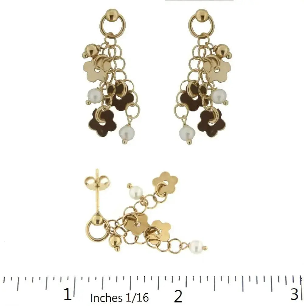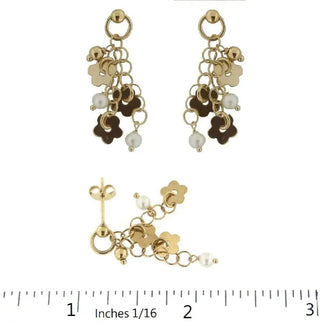Presentamos nuestros Pendientes Colgantes de Perlas y Flores en Oro Amarillo Macizo de 18K, perfectos para niñas de 3 años en adelante. Estos hermosos pendientes miden 1.15 x 0.23 pulgadas (29.2mm x 5.8mm), con un diseño impresionante que cuelga de una bola de 3mm. Los pendientes muestran dos filas de cadena rollo abierta con flores pulidas, bolas satinadas y perlas cultivadas de 3mm, todo elaborado con meticulosa atención al detalle.