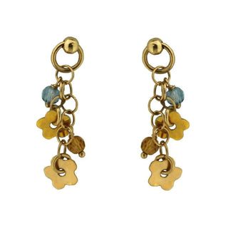 El diseño comienza con una bola de oro pulido de 2.5 mm, de la cual cuelga delicadamente un anillo que recuerda a un encantador timbre. De este anillo, una fina cadena abierta cae con gracia, adornada con cristales brillantes de citrino y topacio azul colocados a lo largo de la cadena. Completando el look encantador hay dos flores de oro pulido, que añaden un toque caprichoso y elegante al diseño.