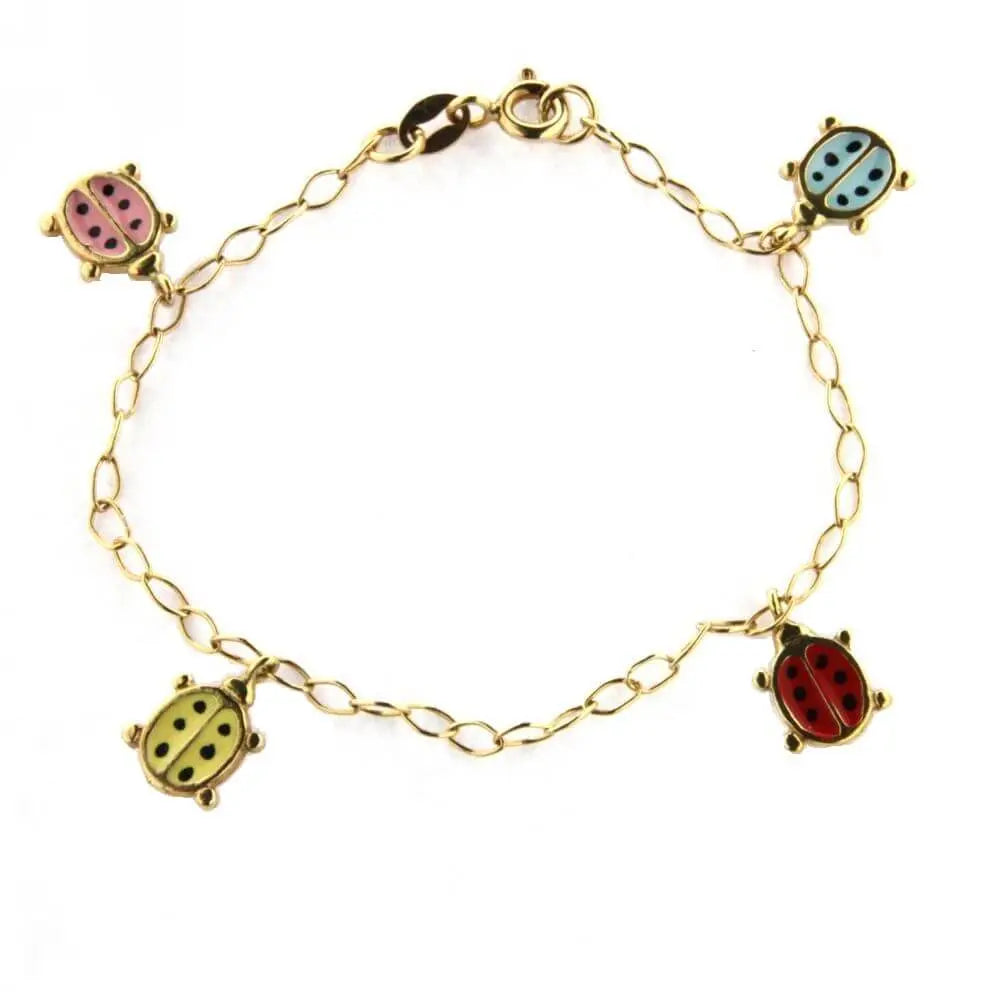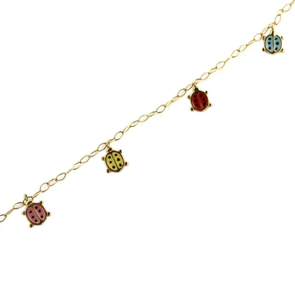 Pulsera de encanto de mariquita con esmalte multicolor de oro amarillo de 18K de 6 pulgadas