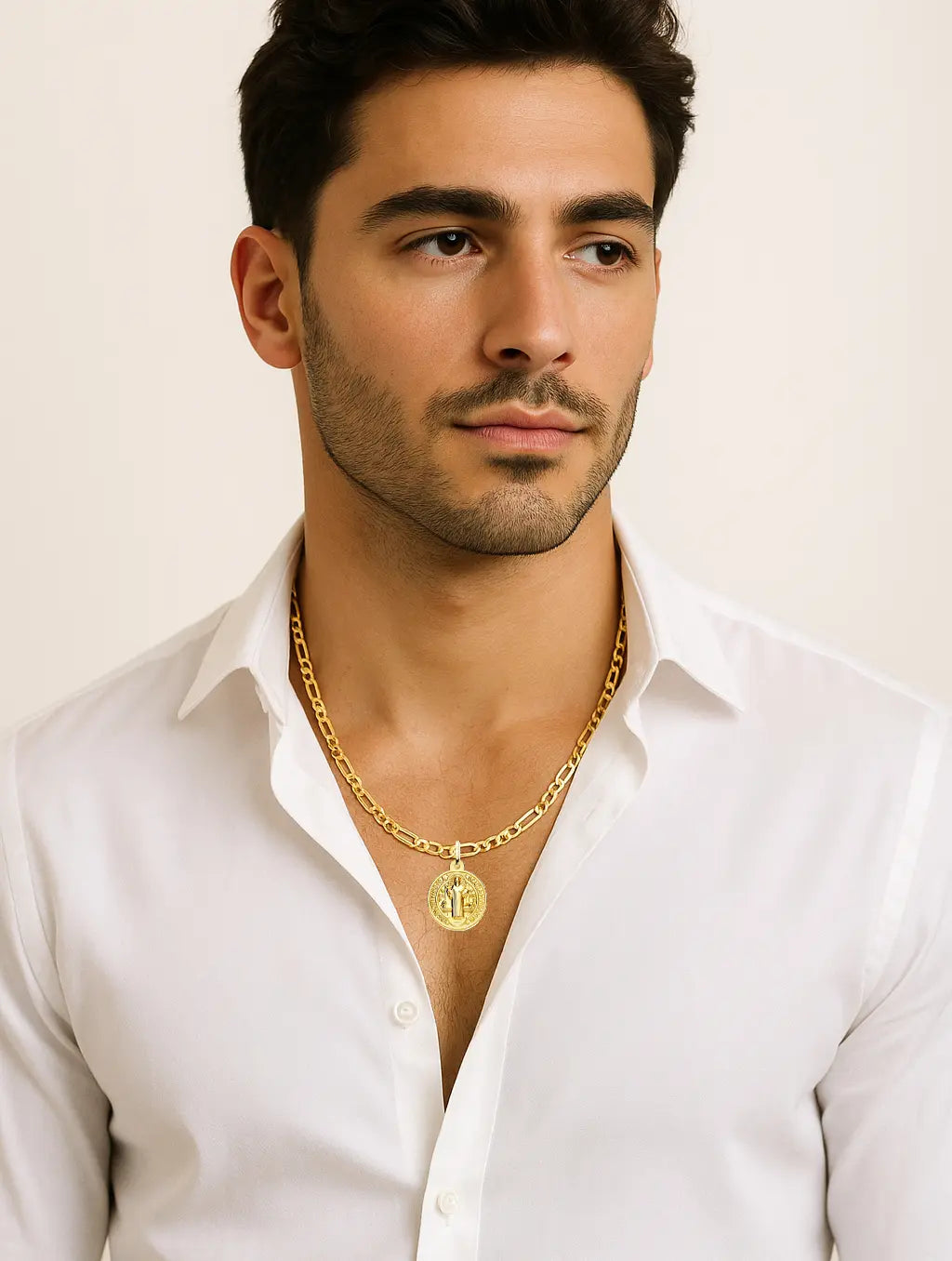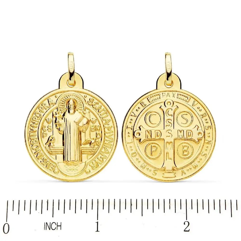 Abraza la rica tradición espiritual de la Medalla San Benito de Oro Amarillo Macizo de 18K para Hombre Tamaño 24mm. Expertamente elaborada en oro amarillo hipoalergénico de 18K, esta medalla sacramental cristiana mide 0.94 pulgadas (24mm) de diámetro, ofreciendo un equilibrio perfecto entre elegancia y significado religioso. El frente muestra la imagen venerada de San Benito, mientras que el reverso está inscrito con el poderoso mantra “Vade retro satana” (“¡Apártate, Satanás!”), que se cree protege contra maldiciones, el mal y el vicio, promoviendo la salud, el bienestar y la protección espiritual.