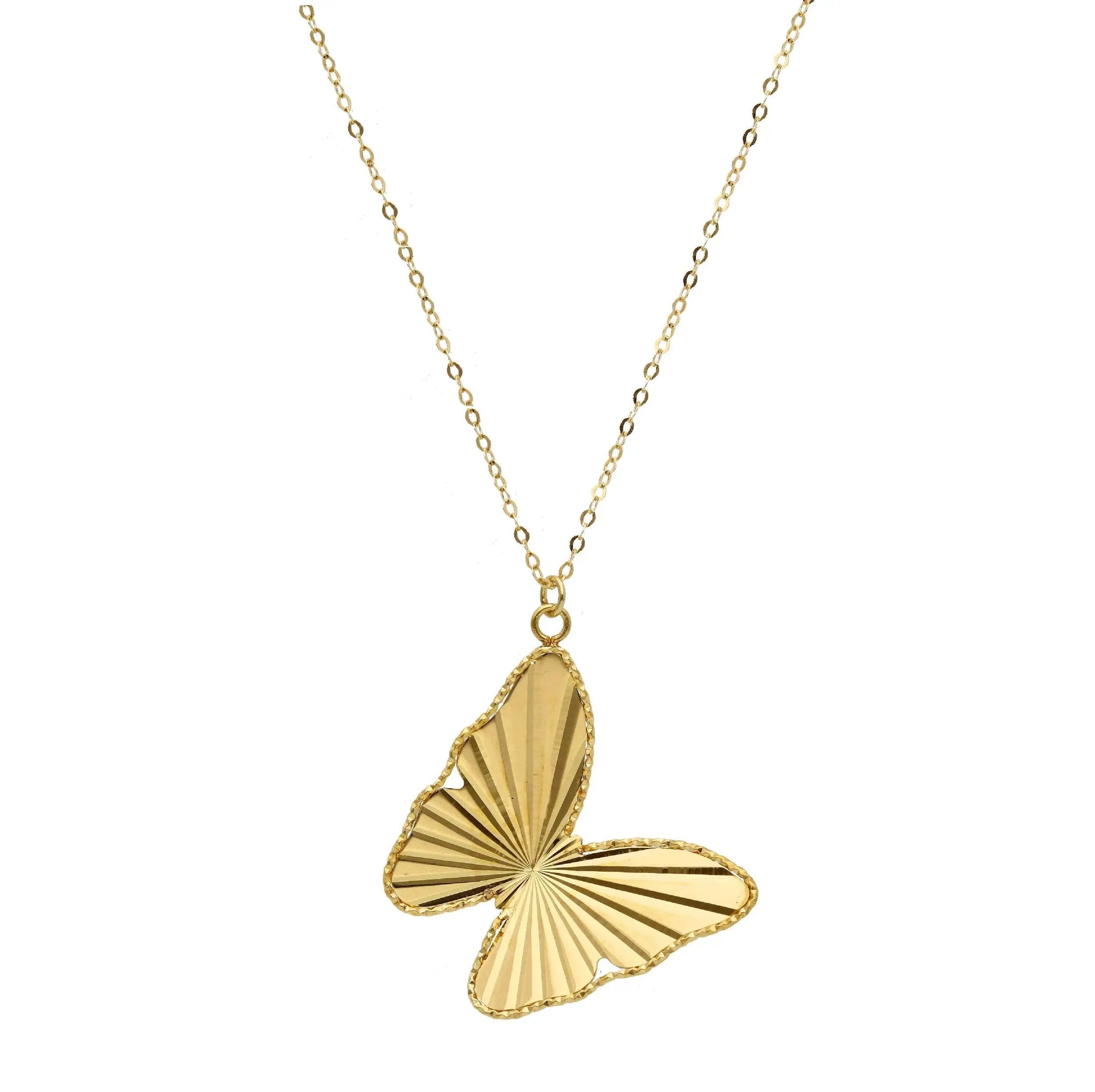 Celebra la elegancia y la luz con el Collar Colgante de Mariposa con Corte de Diamante en Oro Amarillo Macizo de 18K, un impresionante símbolo de transformación y belleza. Expertamente fabricado en Italia con oro amarillo macizo hipoalergénico de 18K, este collar es libre de plomo y níquel, garantizando comodidad y un brillo que dura toda la vida. La pieza central presenta una mariposa facetada con corte de diamante que cuelga delicadamente en diagonal, capturando y reflejando la luz con cada movimiento elegante. Suspendido de una elegante cadena de cable con corte de diamante de 18 pulgadas y un seguro cierre de langosta, el collar ofrece una longitud total de 19 pulgadas, creando una silueta refinada que complementa cualquier escote. Perfectamente equilibrado entre el brillo moderno y la sofisticación atemporal, esta pieza brilla sin esfuerzo ya sea usada a diario o en ocasiones especiales. Una elección hermosa para cumpleaños, graduaciones o regalos significativos, llega en la caja de regalo exclusiva de Amalia Jewelry, lista para deleitar a alguien especial con la artesanía italiana y el puro resplandor del oro de 18K.