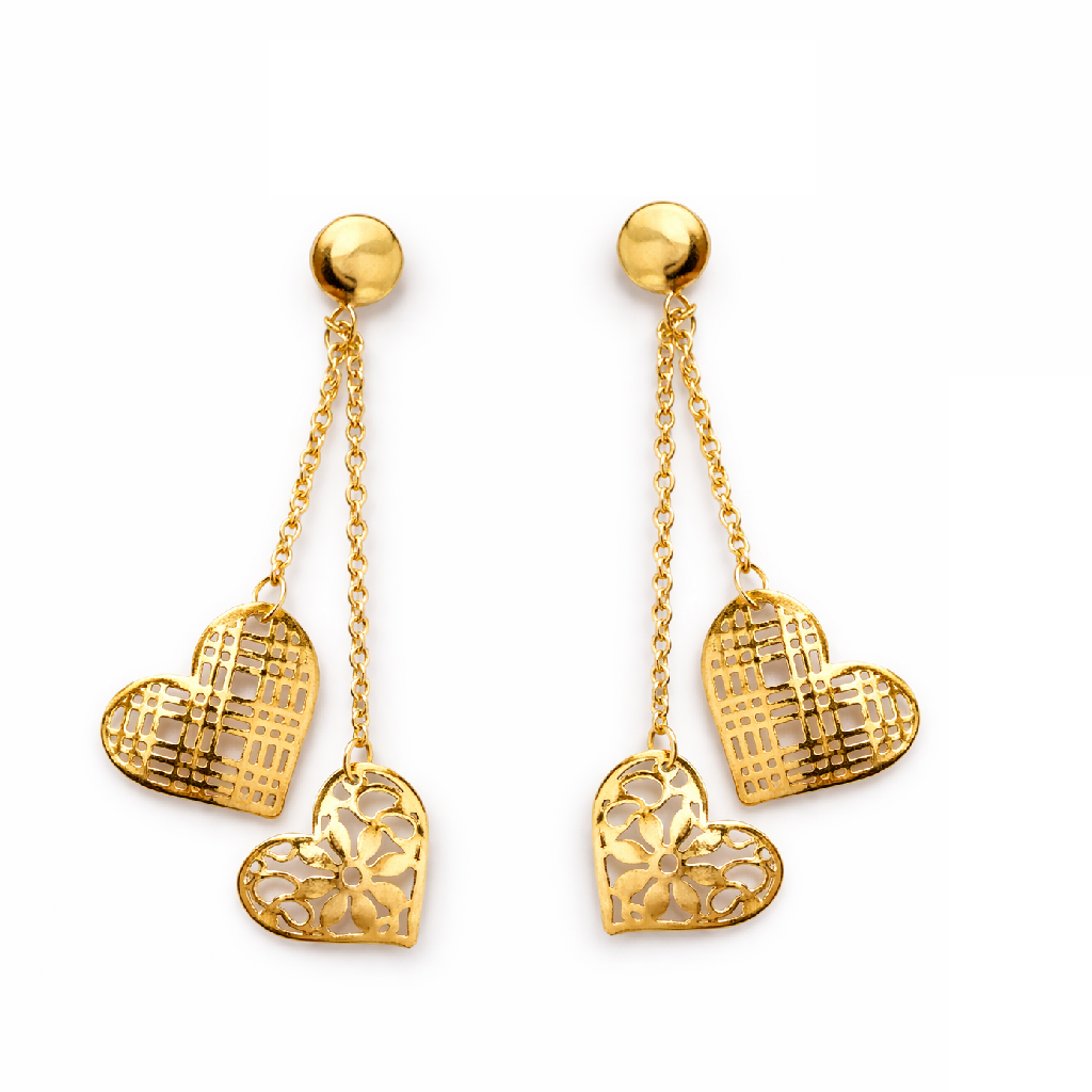 Celebrate Italian craftsmanship with these elegant 18K Yellow Gold Flowers and Lines Dangle Hearts Earrings, designed to combine movement, symbolism, and refined detail. Each earring features a polished 5 mm round top that suspends two delicate rollo chains, creating graceful motion with every step. At the end of each chain hangs a polished heart—one showcasing an open-cut floral motif, and the other finished with modern open cross-line detailing for a contemporary contrast.
