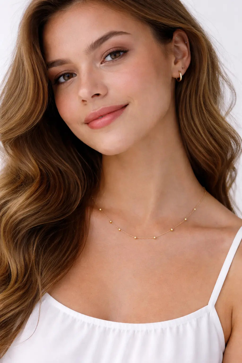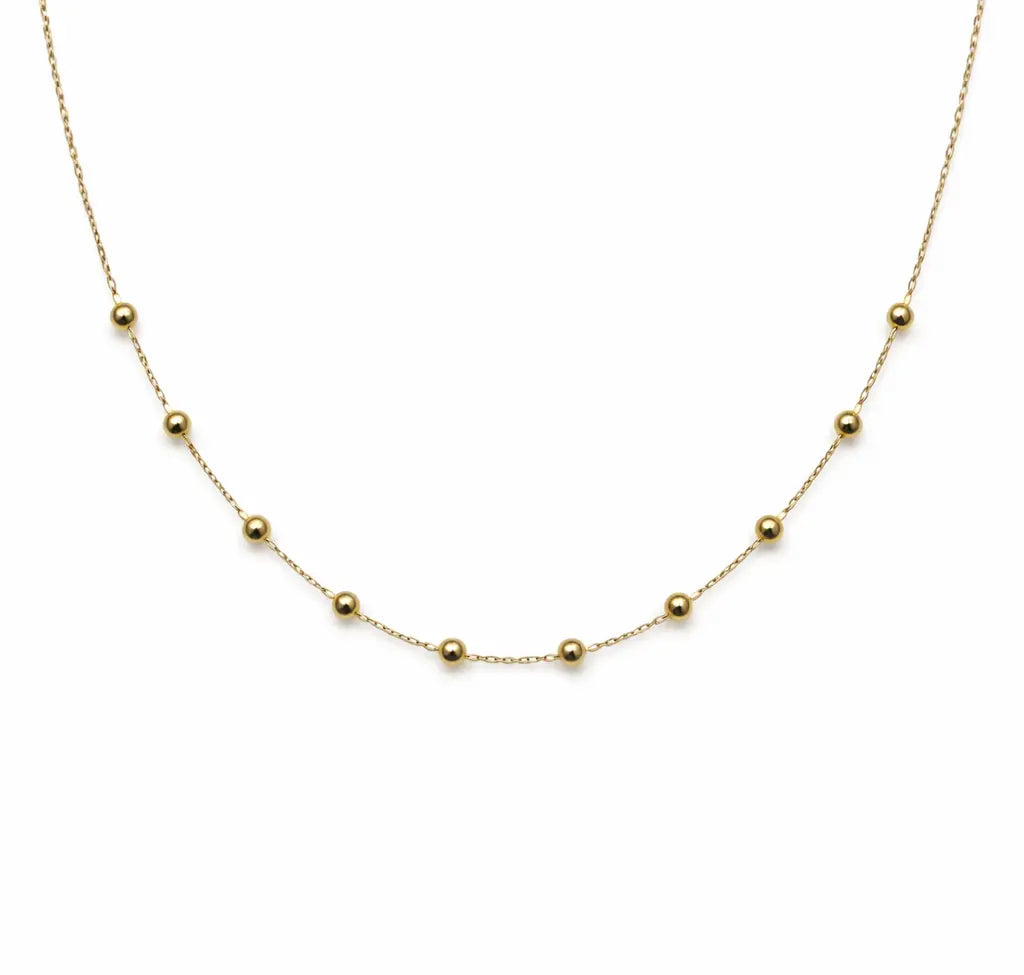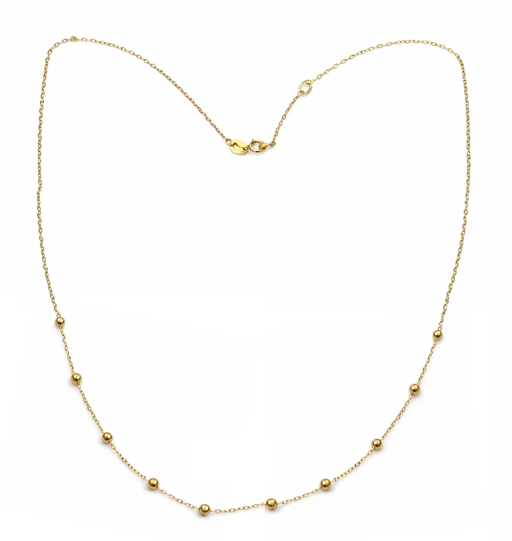 Realza tu colección de joyas con esta delicada cadena de mini cuentas centrales pulidas en oro amarillo macizo de 18K, una pieza refinada diseñada para aportar un toque de lujo discreto a cualquier estilo. Elaborada en Italia, esta cadena muestra una artesanía excepcional con su diseño de eslabones cortados en diamante y diez cuentas de oro pulido (2.1 mm cada una), creando un efecto brillante y sofisticado.