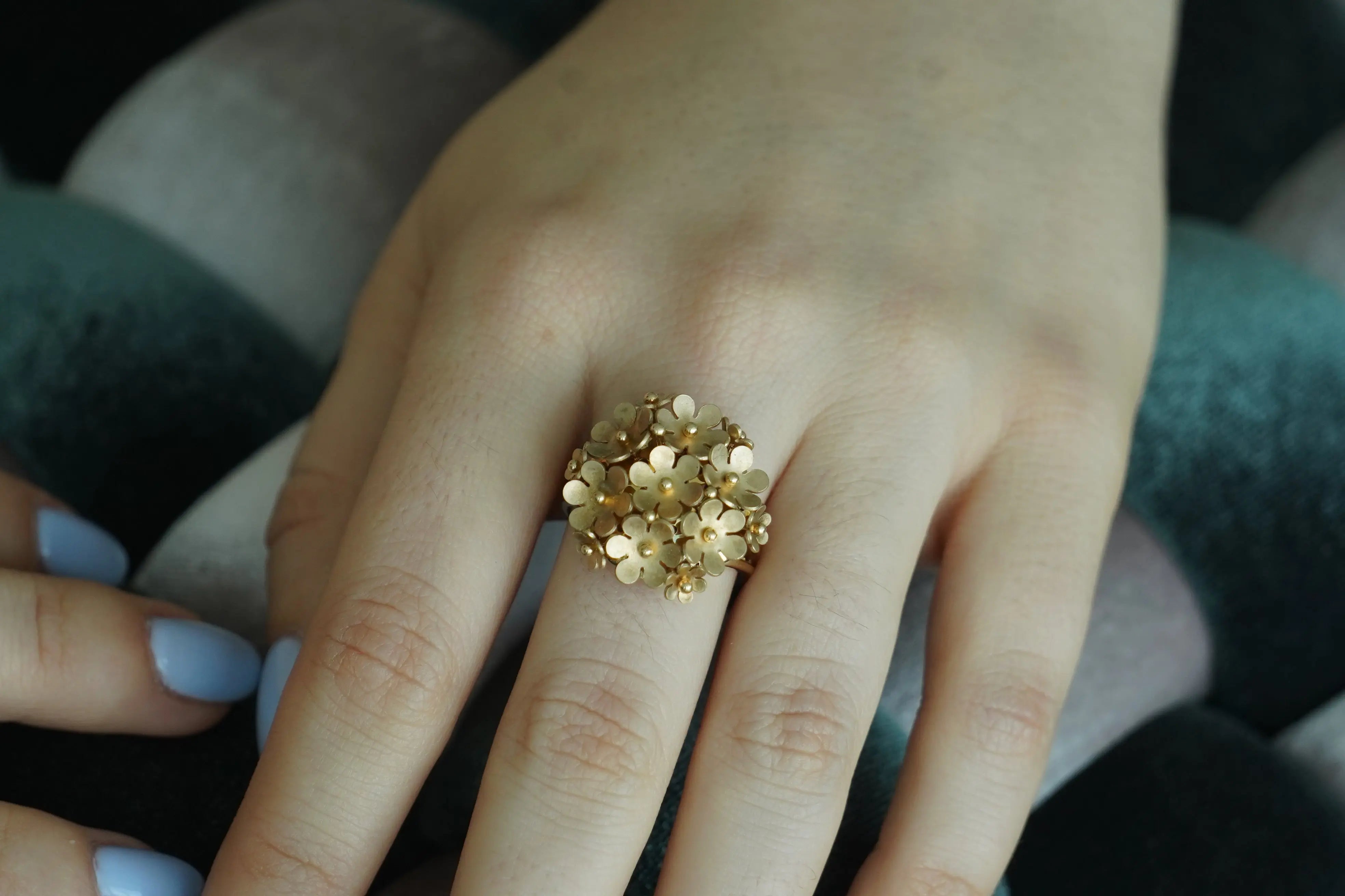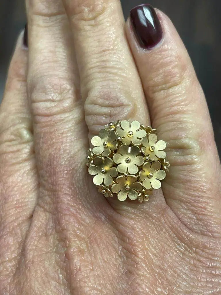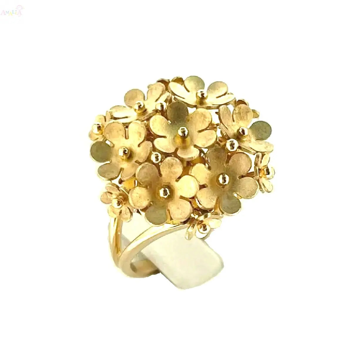Celebra la elegancia atemporal con nuestro Anillo Domo con Ramo de Flores de Satén en Oro Amarillo Macizo de 18K, una pieza de lujo elaborada con precisión en Italia. Este anillo bellamente diseñado presenta un encantador ramo de flores con acabado satinado y textura suave, cada una con un centro pulido que capta la luz con cada movimiento. El arreglo floral forma un elegante domo que mide 0.78 pulgadas (19.8 mm) de diámetro, convirtiéndolo en un accesorio destacado con una dimensión elegante. Con un peso de 7.80 gramos, este anillo se siente sustancial pero refinado, perfecto para quienes aprecian la artesanía fina y el diseño significativo. Con una talla de anillo de 7.50, puede ajustarse hacia arriba o hacia abajo para un ajuste perfecto. Fabricado con oro amarillo macizo hipoalergénico de 18K, lleva el auténtico sello de oro italiano 750, garantizando calidad y pureza. Ya sea que marques una ocasión especial o simplemente te deleites con la elegancia diaria, este anillo se presenta en una caja de regalo exclusiva de Amalia, listo para regalar o atesorar de por vida.