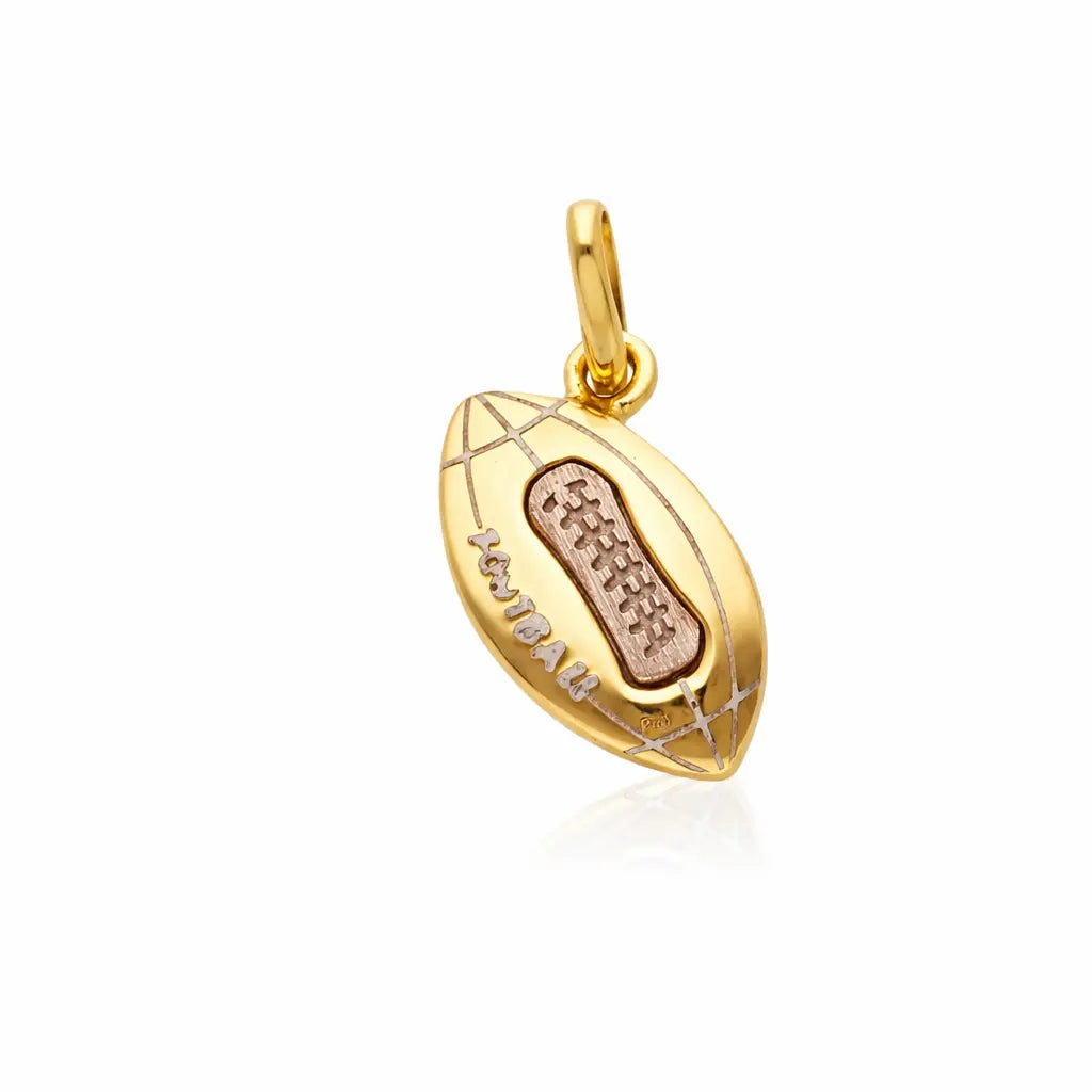Este colgante de fútbol americano pulido de oro macizo bicolor de 18 quilates es imprescindible para cualquier entusiasta del fútbol. Elaborado en oro amarillo hipoalergénico de 18 quilates, el colgante presenta detalles intrincados, incluyendo los cordones, las líneas y la palabra "Football" en oro blanco para un contraste impresionante.