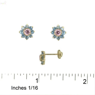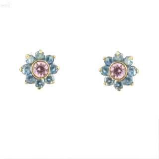 18K Gold Blue and Pink Zirconia Flower Screwback Earrings