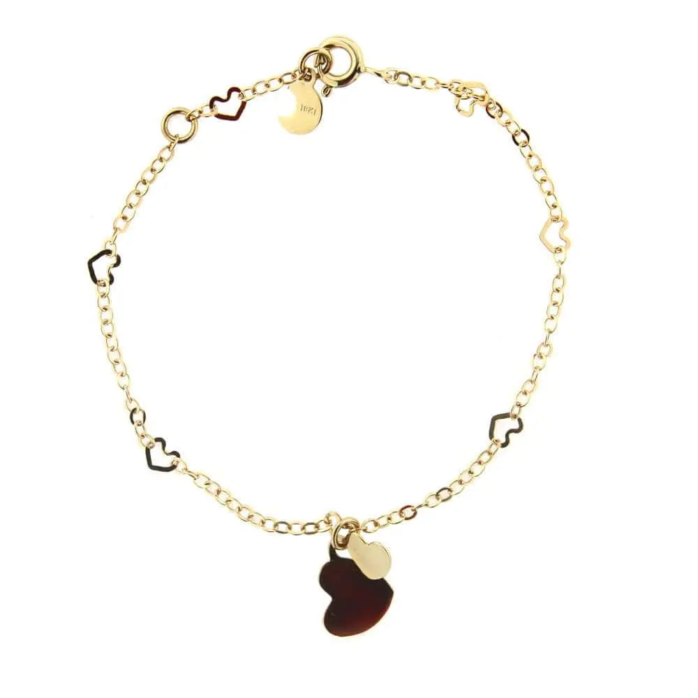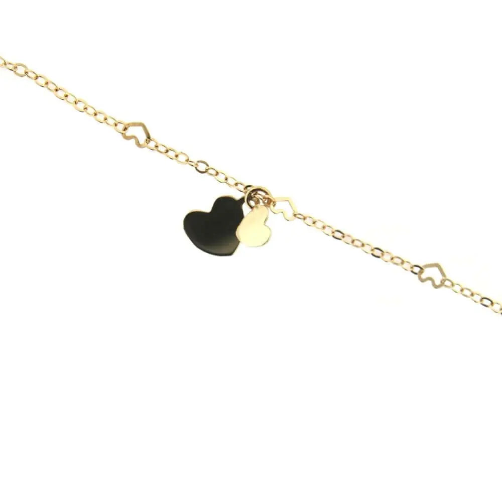Brazalete colgante de doble corazón central de oro amarillo macizo de 18K con cadena de pequeños corazones abiertos