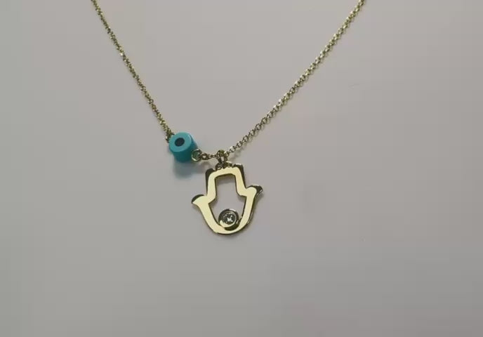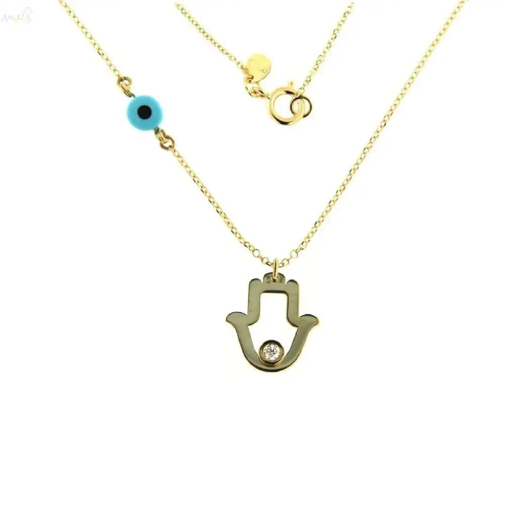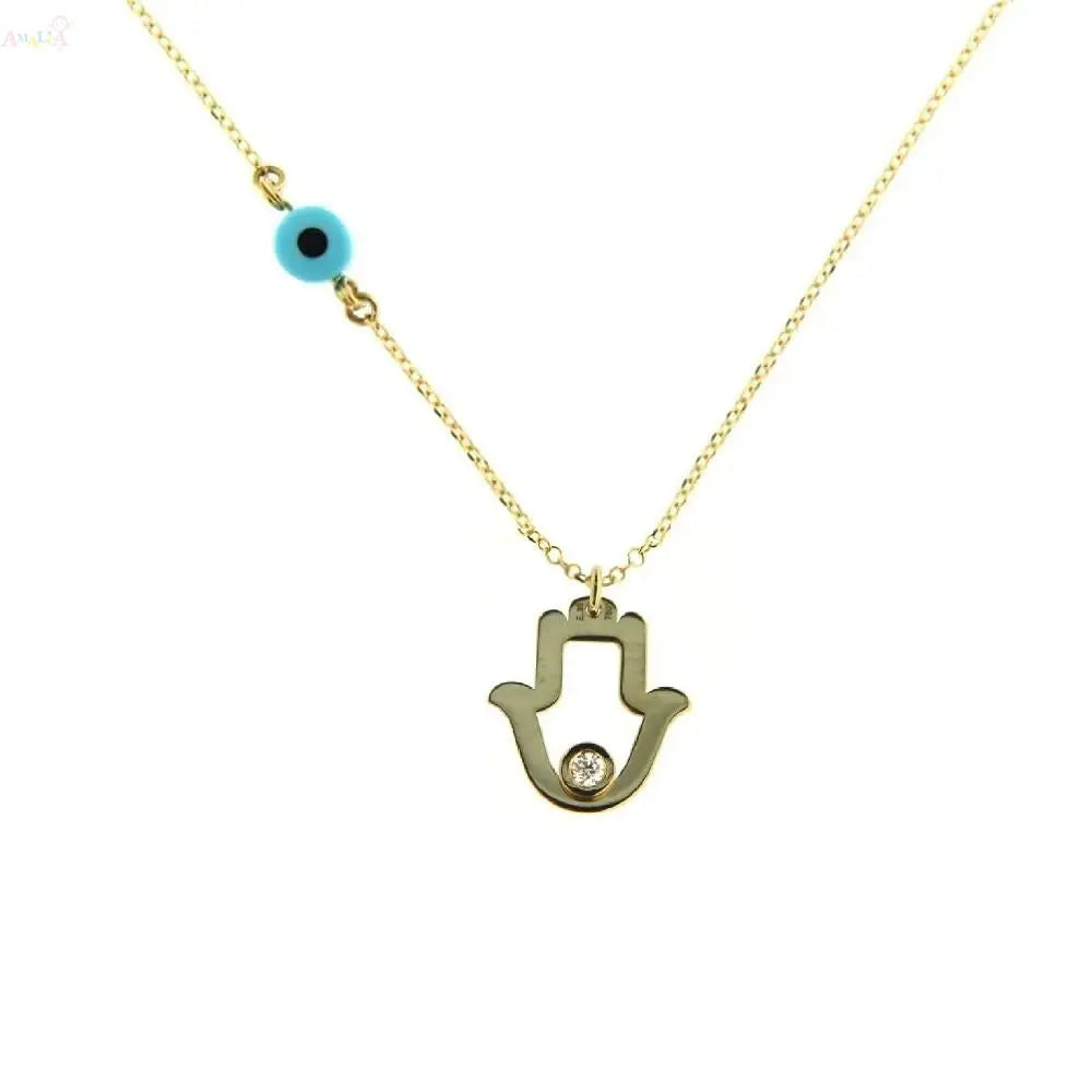 El punto focal de este collar es la mano Hamsa abierta, que alberga un brillante diamante de 0.02 ct en su centro, simbolizando protección y claridad. Acompañando esto está un Ojo Turco cerámico azul, un símbolo reconocido que protege contra la negatividad y trae buena fortuna a quienes lo llevan. Estos elementos se unen para crear un amuleto poderoso contra la adversidad.