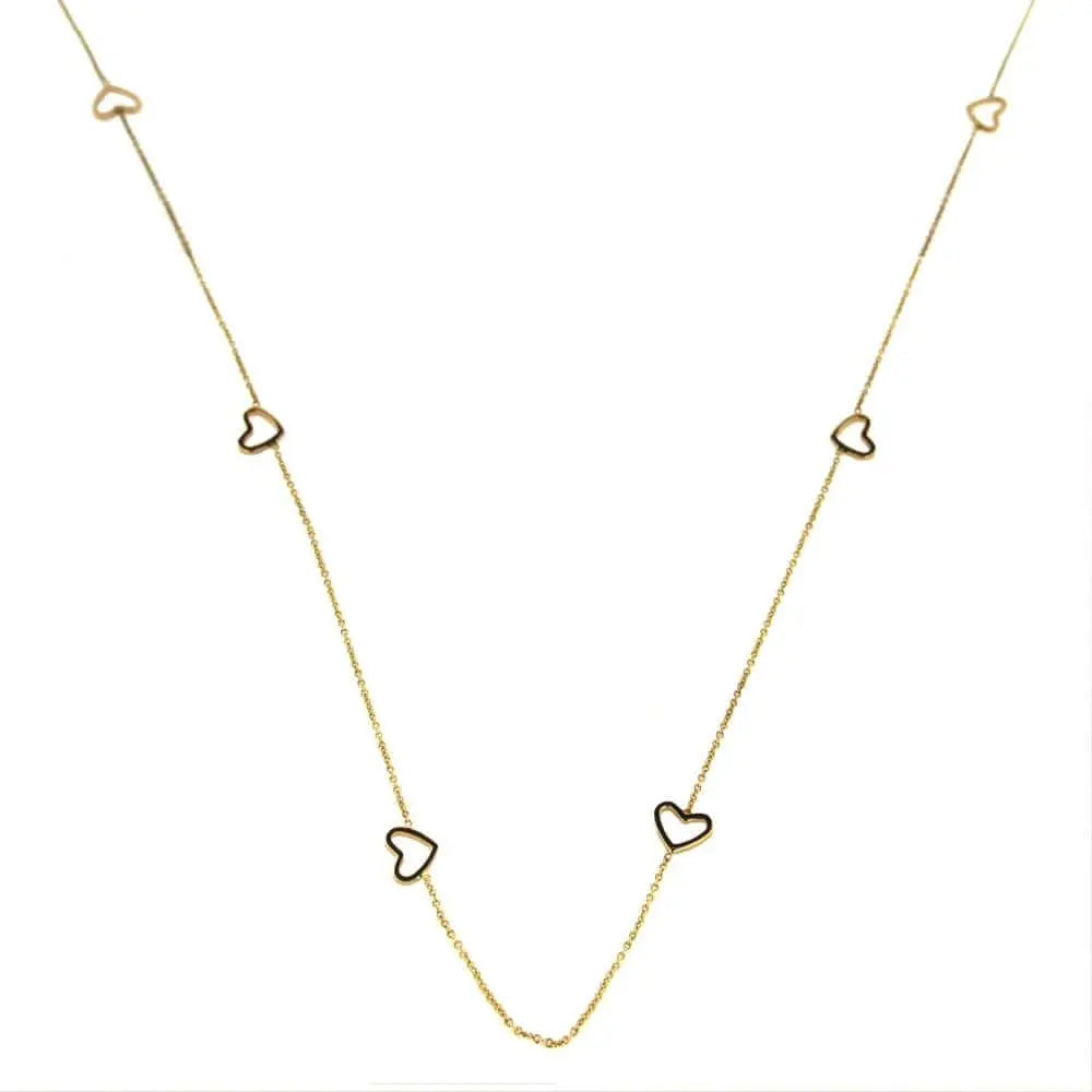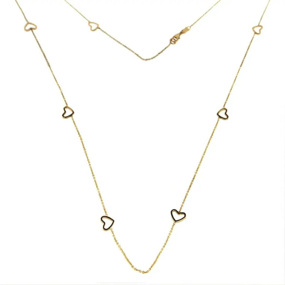 Collar largo de 24 pulgadas con corazones abiertos de oro amarillo macizo de 18k en diferentes posiciones