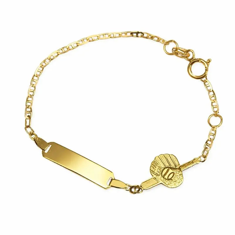 Para los jóvenes aficionados al deporte, nuestra pulsera de identificación de béisbol pulida en oro amarillo macizo de 18 quilates es un jonrón. Esta pulsera de 5.5 pulgadas, con un aro adicional a 4.75 pulgadas para un ajuste personalizable, está elaborada con una cadena de eslabones planos tipo marina que es tanto resistente como elegante. La placa de identificación presenta un bate de béisbol, un guante y una pelota finamente grabados, convirtiéndola en el accesorio perfecto para los niños que aman el juego.