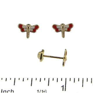 Pendientes con cierre de tornillo cubierto de libélula esmaltada en rojo y blanco de oro amarillo macizo de 18K