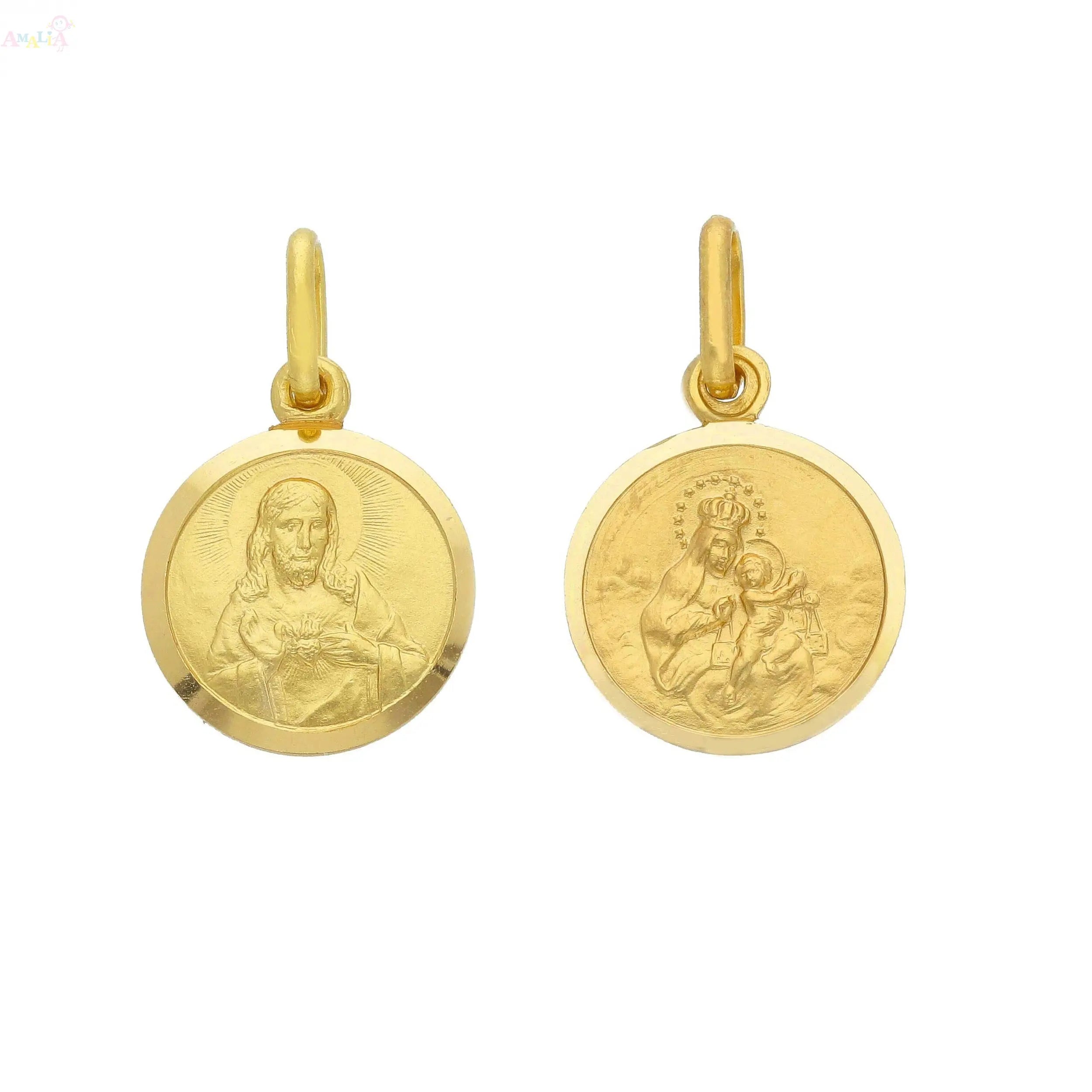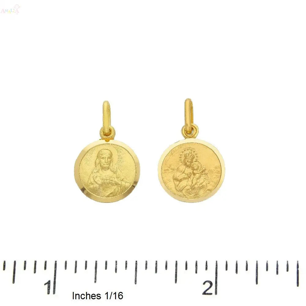 Elaborado en oro hipoalergénico de 18k, esta exquisita pieza mide 0.43 pulgadas (11mm) de diámetro y presenta el Sagrado Corazón de Jesús en el frente y la Virgen del Carmen en la parte trasera, representando el amor divino y la misericordia de Cristo y la protección maternal de María. Cada colgante viene elegantemente presentado en una caja y bolsa de regalo Amalia, lo que lo convierte en un regalo perfecto para cualquier ocasión especial.