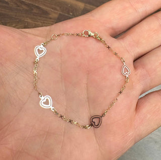 Diseñada para mujeres y niñas de 12 años en adelante, esta pulsera mide 6.5 pulgadas de largo con un anillo extra a 6 pulgadas para un ajuste ajustable. El diseño atemporal bicolor combina la calidez del oro amarillo con la sofisticación del oro blanco, mientras que los corazones abiertos simbolizan el amor duradero. La cadena con corte de diamante de la pulsera añade un hermoso brillo, capturando la luz con cada movimiento.
