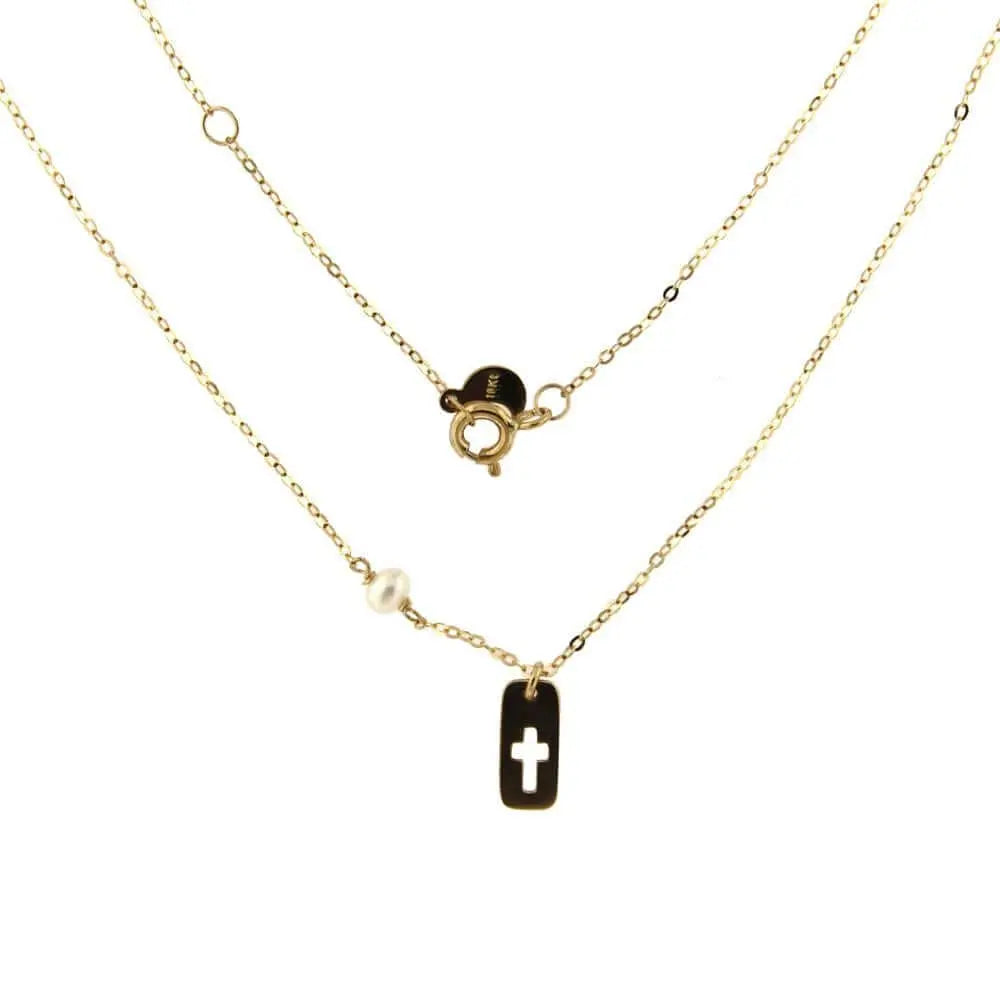 Perla Cultivada Fija de Oro Amarillo 18K con Pequeña Placa de Cruz Abierta L 16 pulgadas